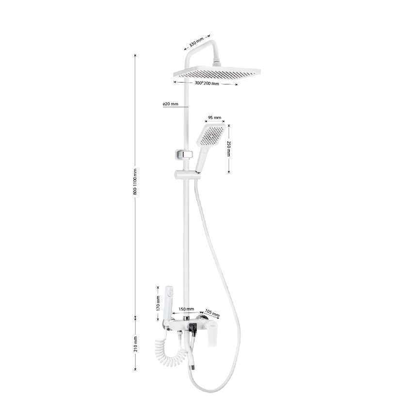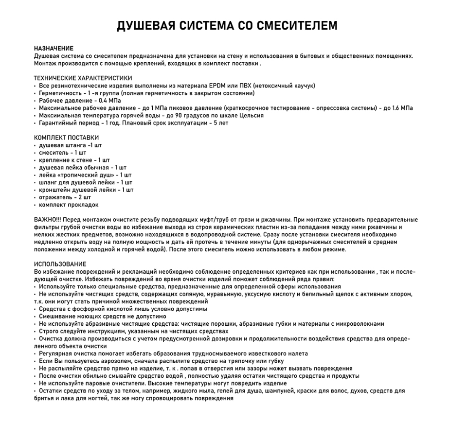 | Комплектация | верхний душ / гигиенический душ / держатель лейки / душевая штанга / кронштейн для верхнего душа / лейка / Смеситель / шланг |