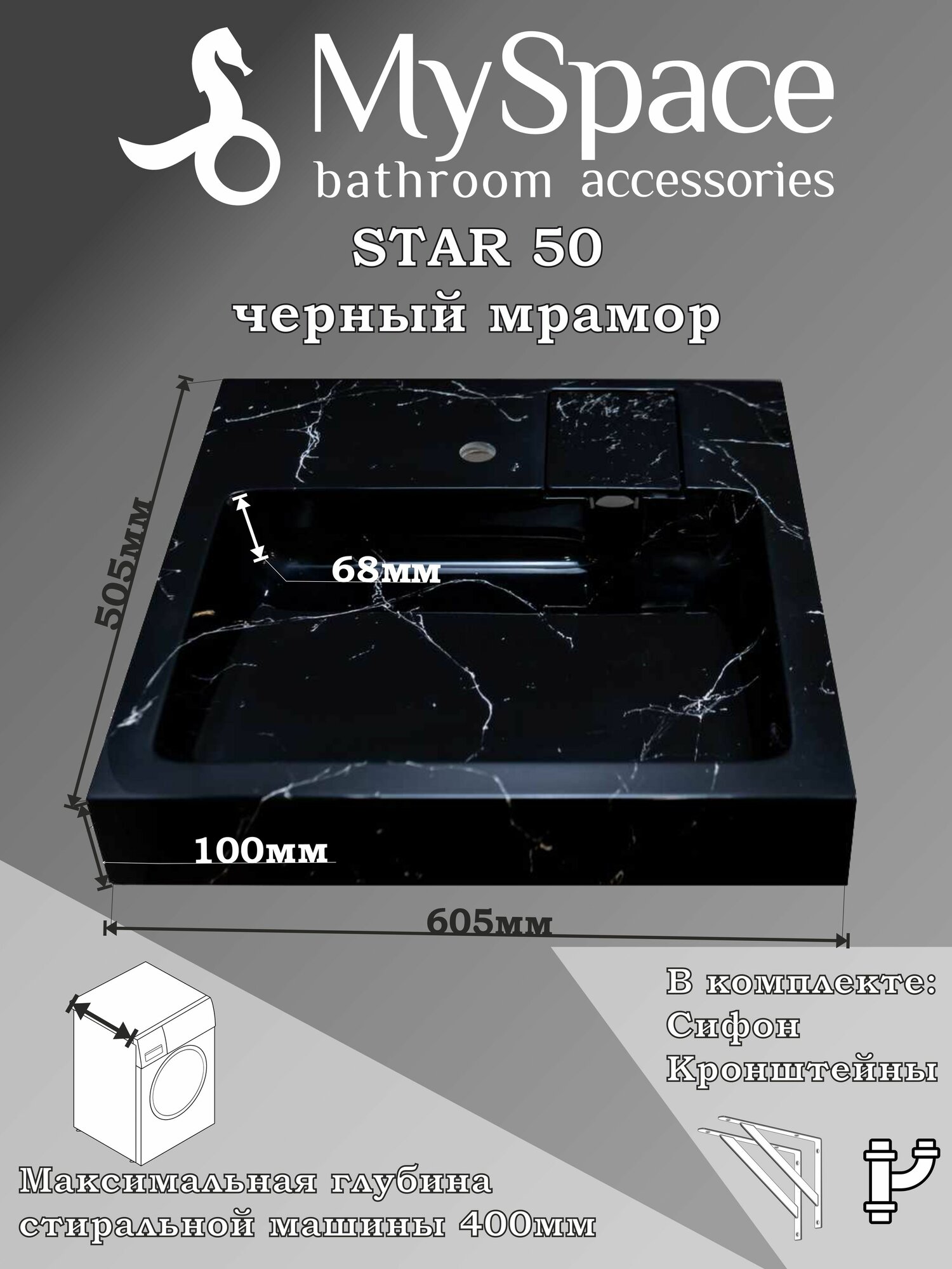 Купить Раковина над стиральной машиной Star 50 Черный мрамор, с кронштейнами и сифоном в комплекте