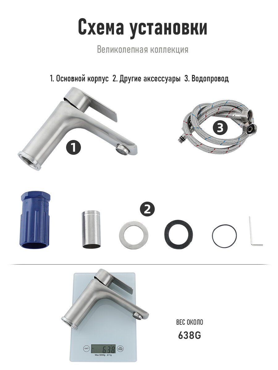 | Комплектация | Смеситель, гибкая подводка |