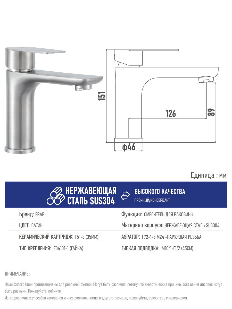 Смеситель для раковины Frap H806 F10806 нержавеющая сталь, сатин