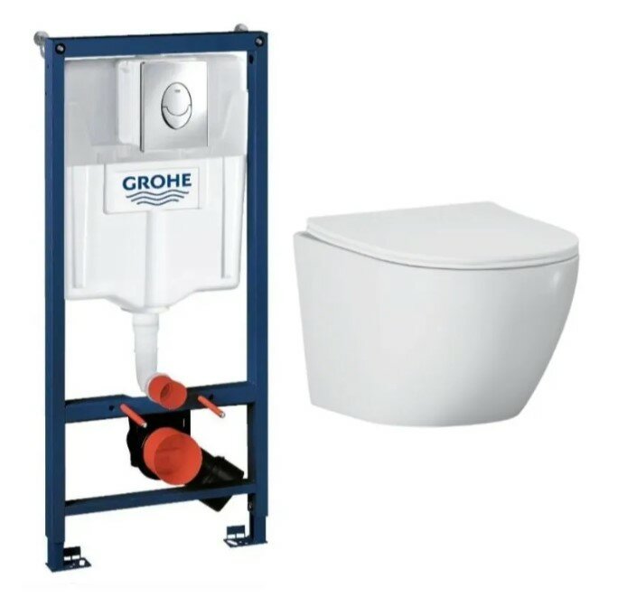 Инсталляция с унитазом Helmken 35103001 комплект 5 в 1: унитаз подвесной безободковый, инсталляция Grohe, овальная кнопка хром, шумоизоляция, сиденье микролифт