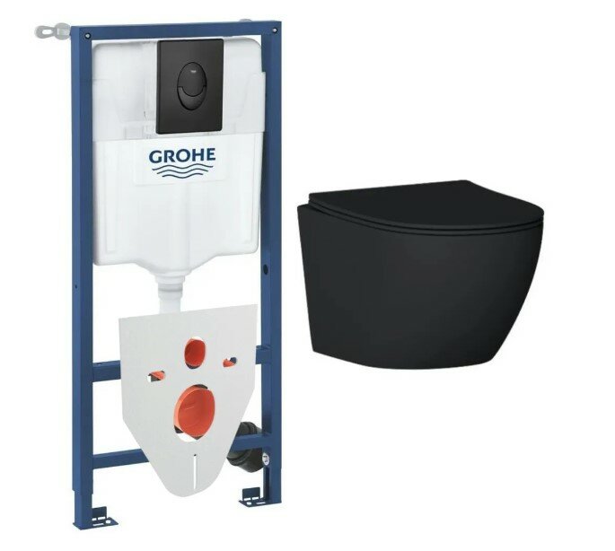Инсталляция с унитазом Helmken 35103001B комплект 3 в 1: унитаз подвесной безободковый, сиденье микролифт, инсталляция Grohe с кнопкой смыва, черный матовый цвет