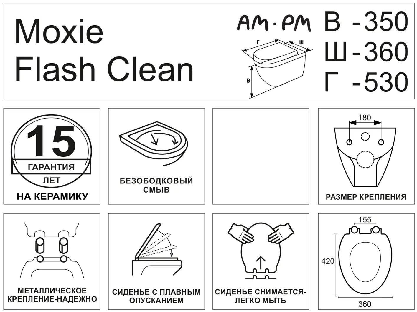 Унитаз подвесной AM.PM Moxie Flash Clean C9M1700SC, безободковый, с сиденьем микролифт интересное: