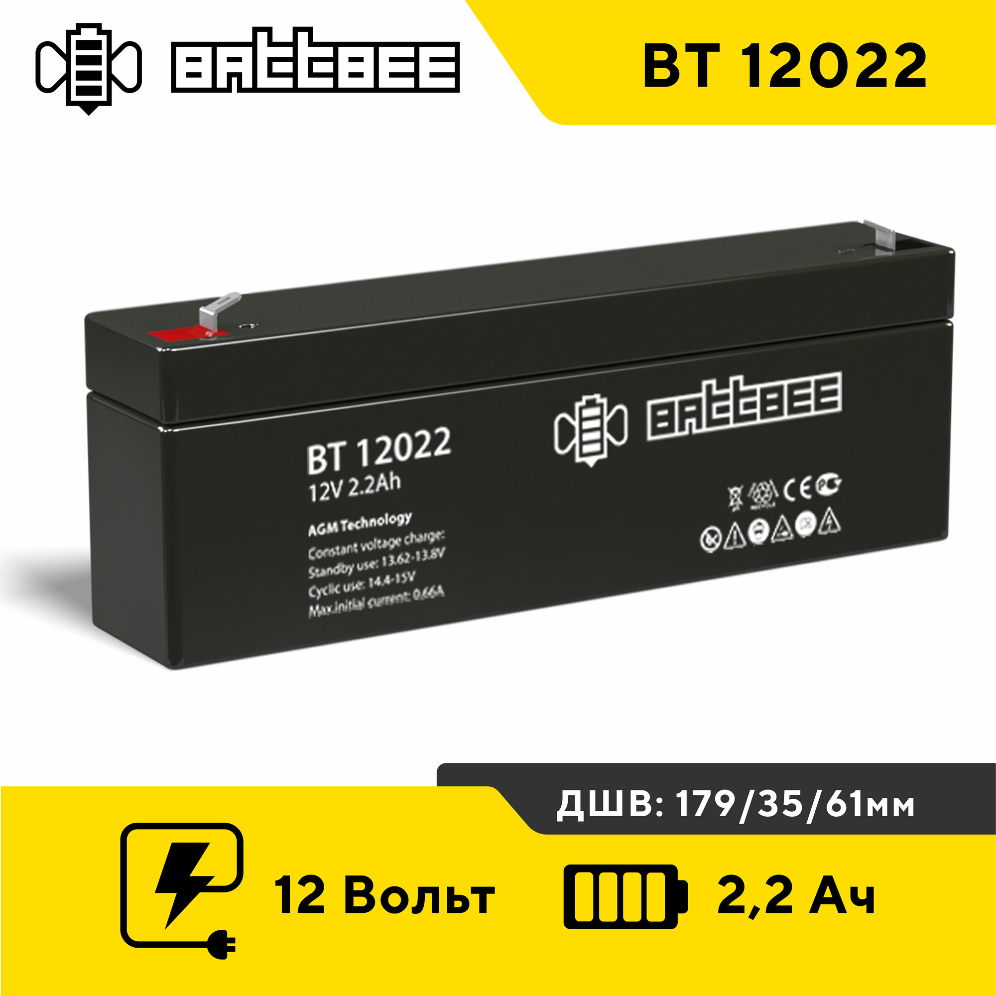 Аккумулятор Battbee BT-12022 (12В, 2.2Ач / 12V, 2.2Ah / вывод F1)