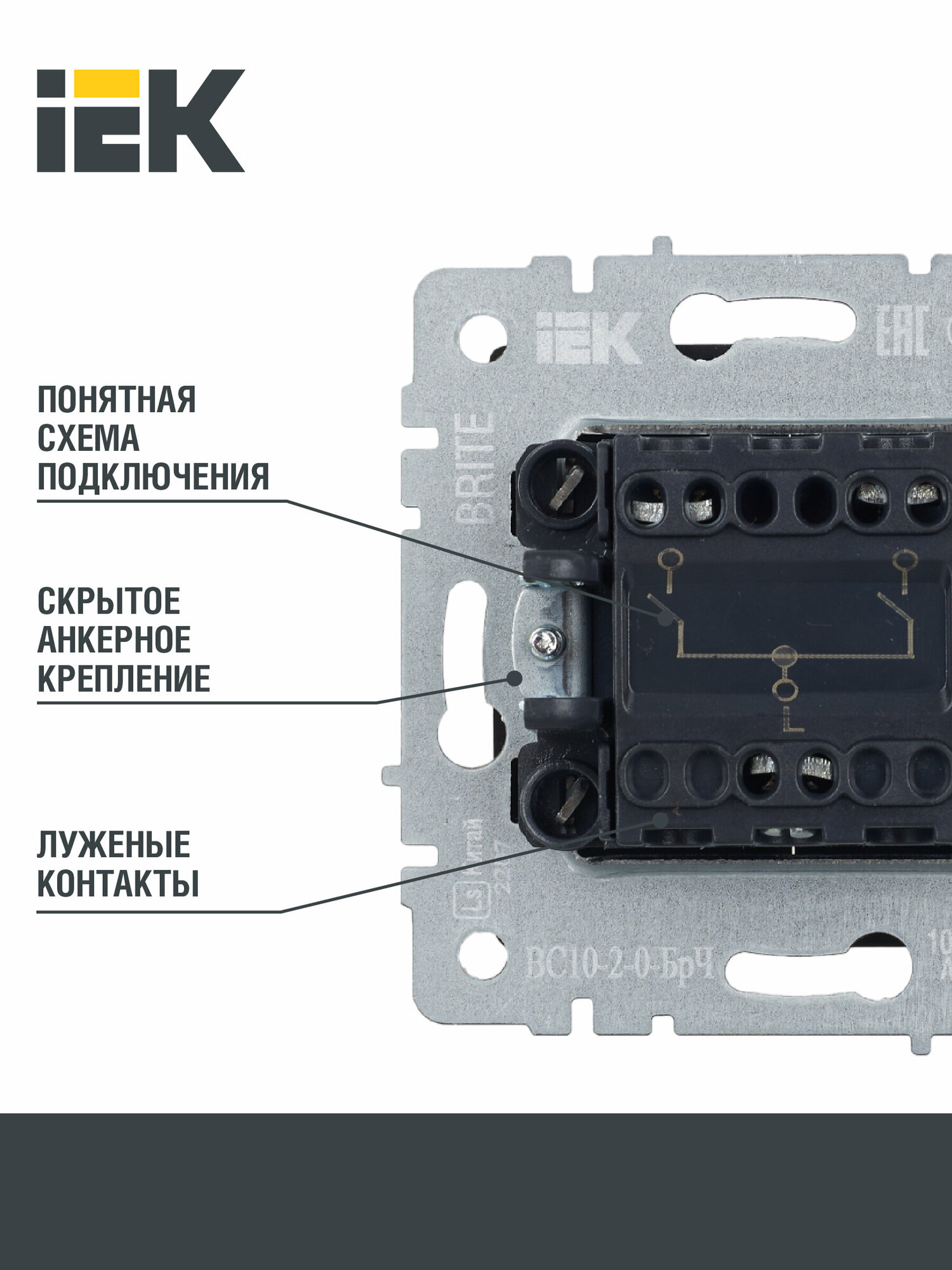 Выключатель 2-кл. СП BRITE ВСР10-2-0-БрБ 10А в сборе бел. BR-V20-0-10-K01-F IEK