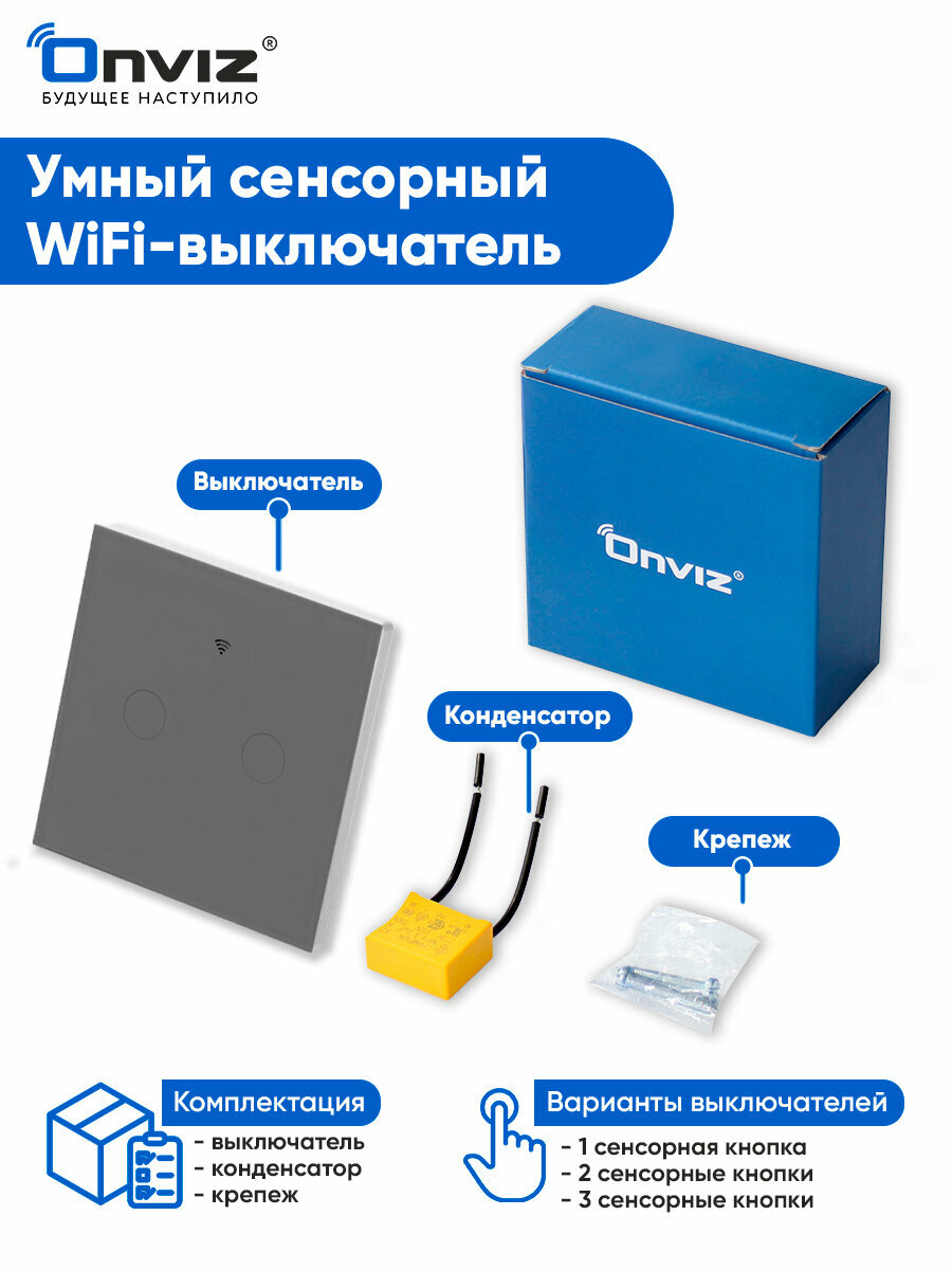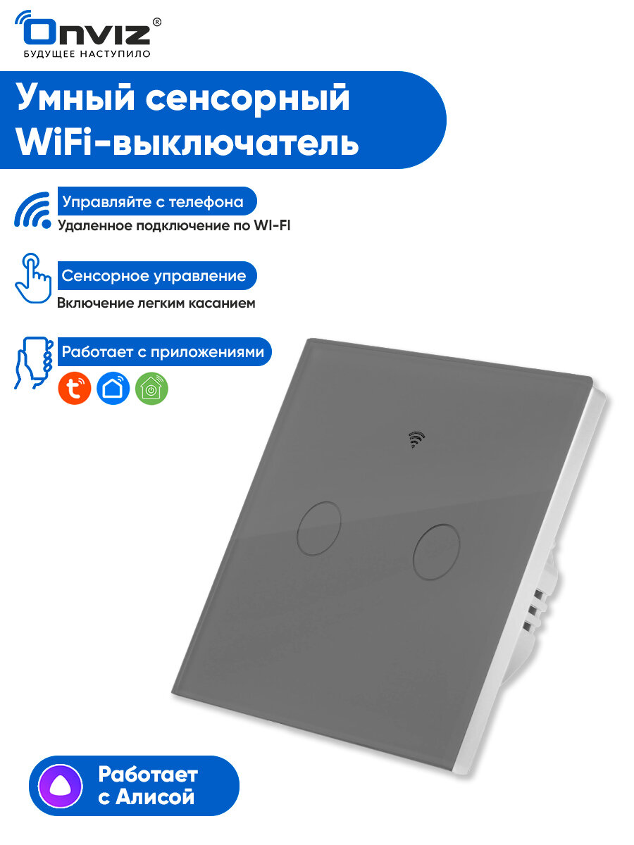 Купить Умный сенсорный Wi-Fi выключатель Tuya (серый) 2хклавишный - универсальный без нуля и с нулем - работает с Алисой