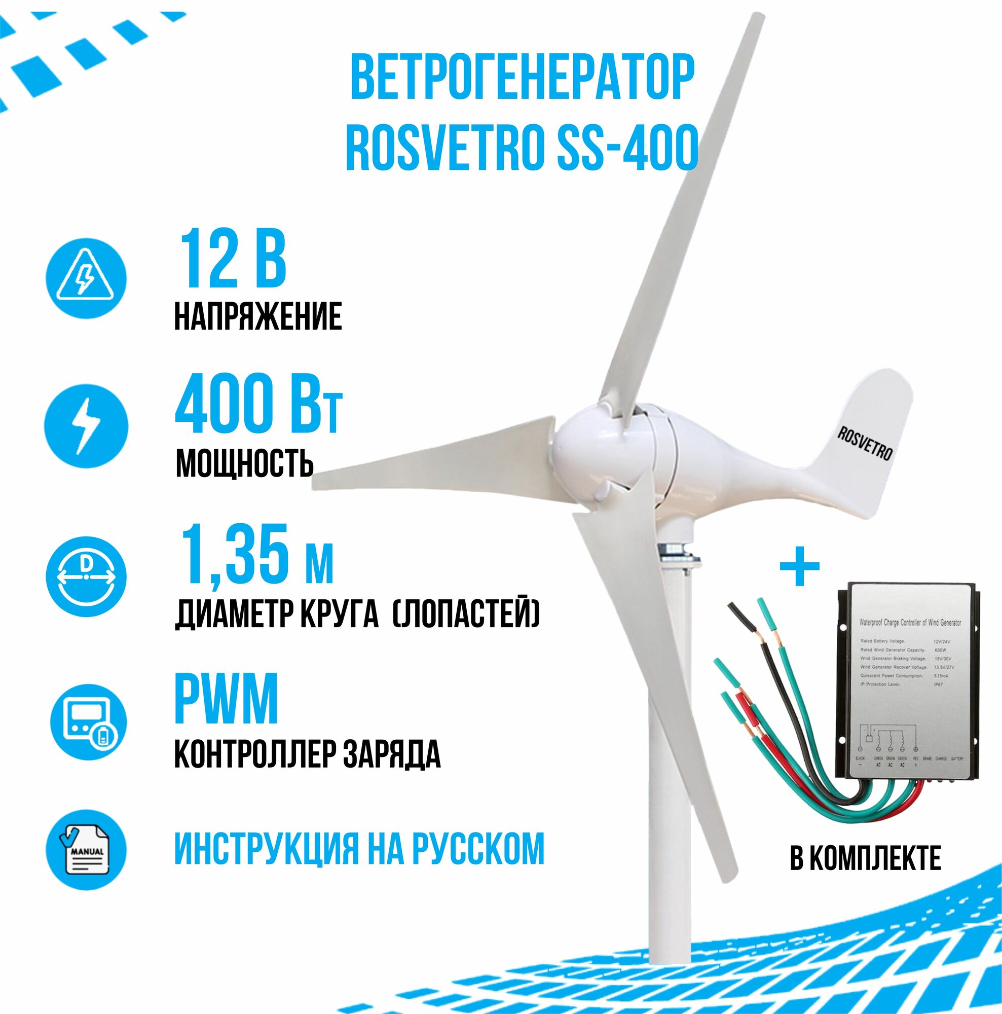 Ветрогенератор горизонтальный ROSVETRO SS-400 на 400Вт 12В для дома с контроллером заряда интересное: