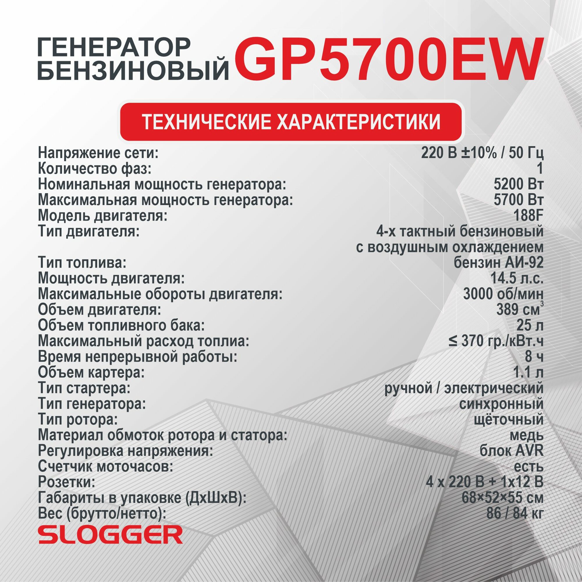 Генератор бензиновый Электрический с электростартером Slogger GP5700EW (5.2 кВт, 14.5 л.с,) интересное: