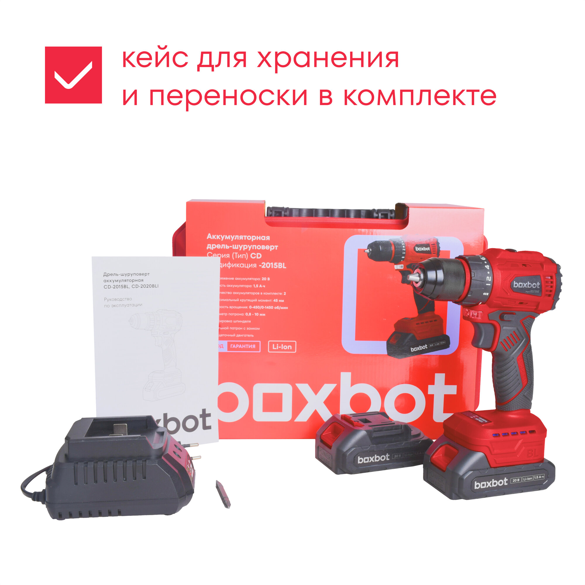 Аккумуляторная бесщеточная дрель-шуруповерт Boxbot 20В, 2 АКБ 1,5 Ач, в кейсе, CD-2015BL интересное: