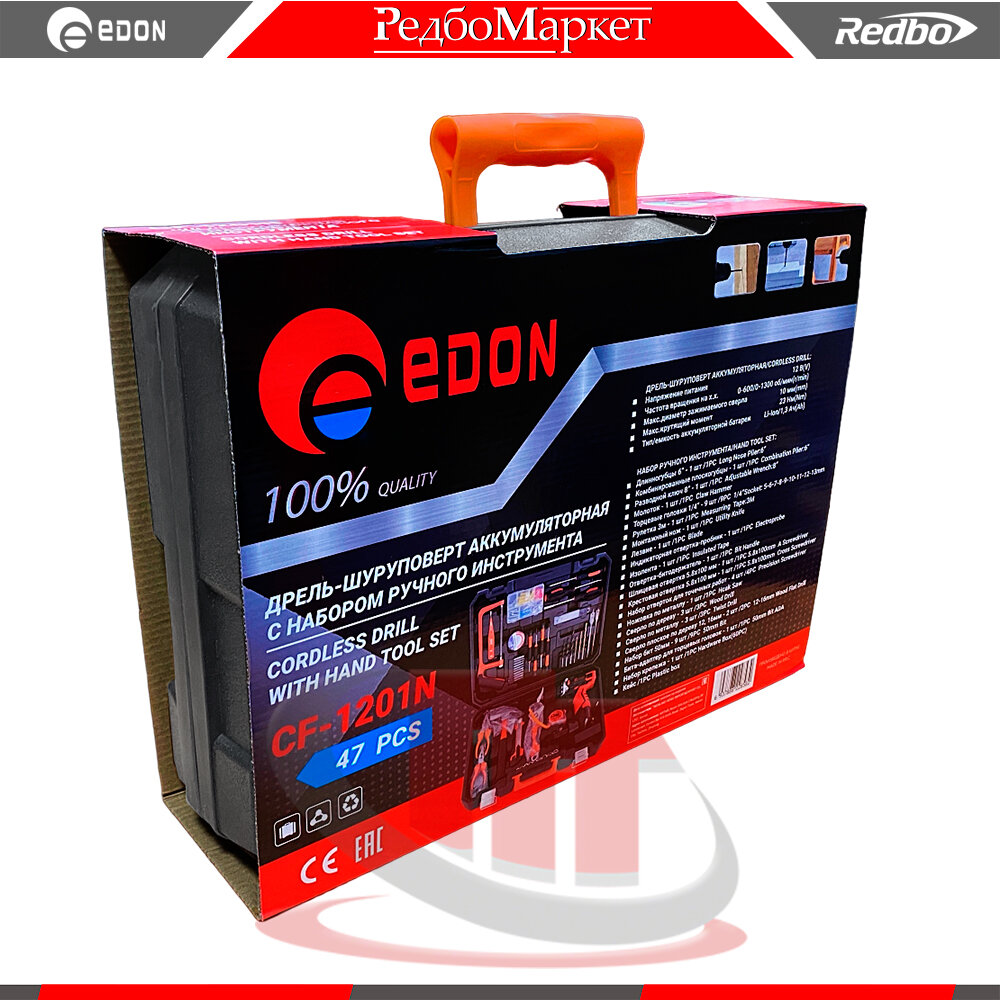 Купить Дрель-шуруповерт аккумуляторная Edon CF-1201N с набором ручного инструмента (50 предметов)