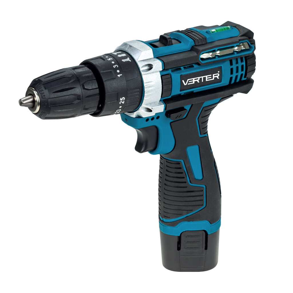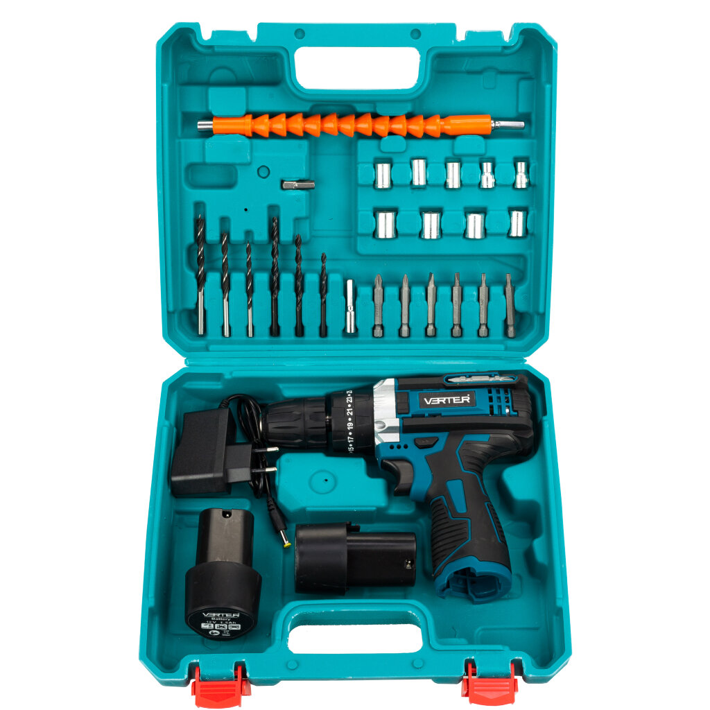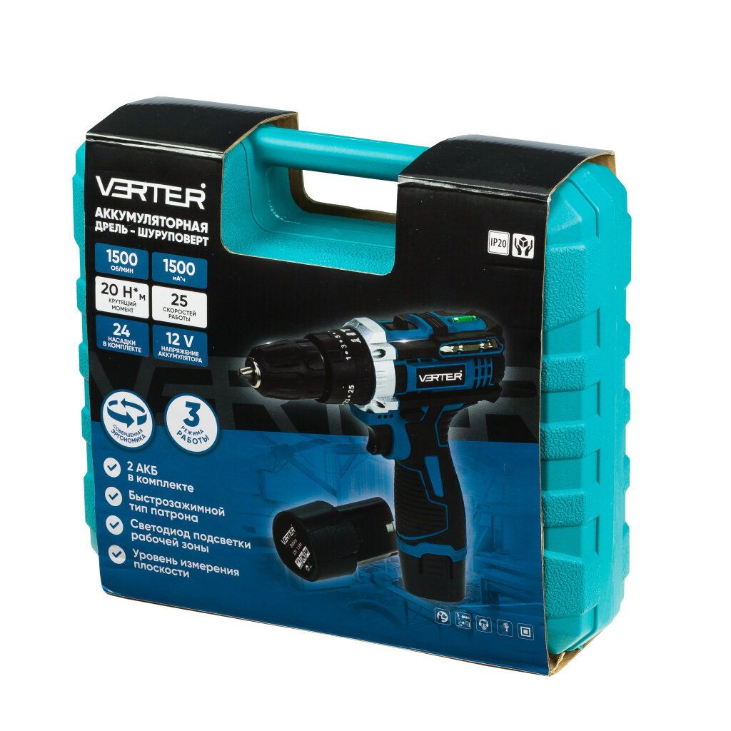Купить Аккумуляторная дрель-шуруповерт Verter с 2 скоростями и подсветкой, 24 насадки, 12 В, 2 АКБ в кейсе