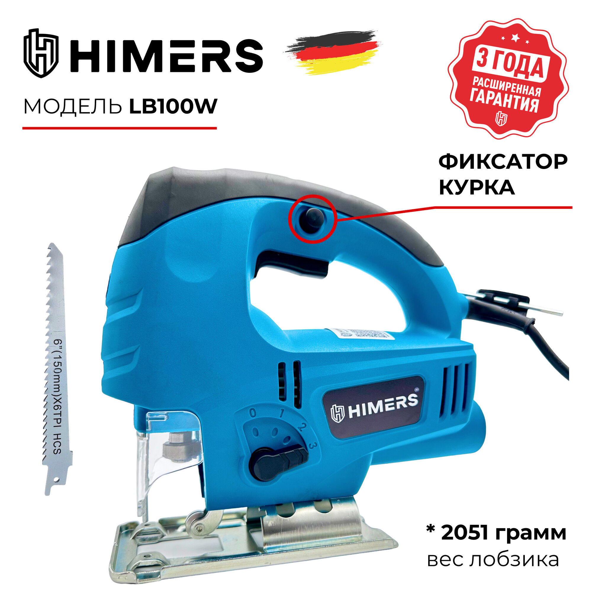 Лобзик сетевой HIMERS LB1000В, 220v, 1000 вт, 3150 об/мин, ход пилки 24мм, лазер красный, подключение пылесоса, 6 скоростей