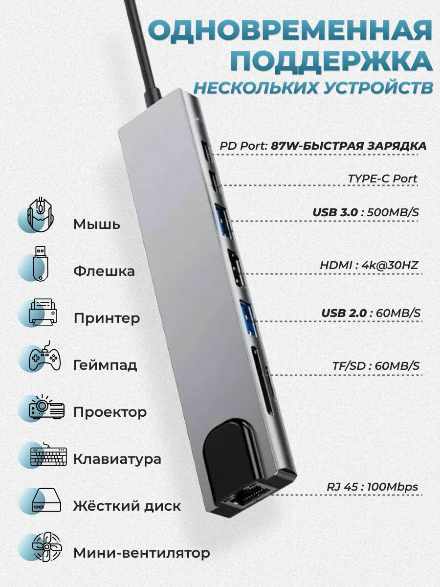 Купить USB HUB разветвитель 8 в 1 Type C для MacBook / USB / HDMI адаптер 4k/ RJ-45 адаптер / USB HUB 3.0 / картридер для ноутбука