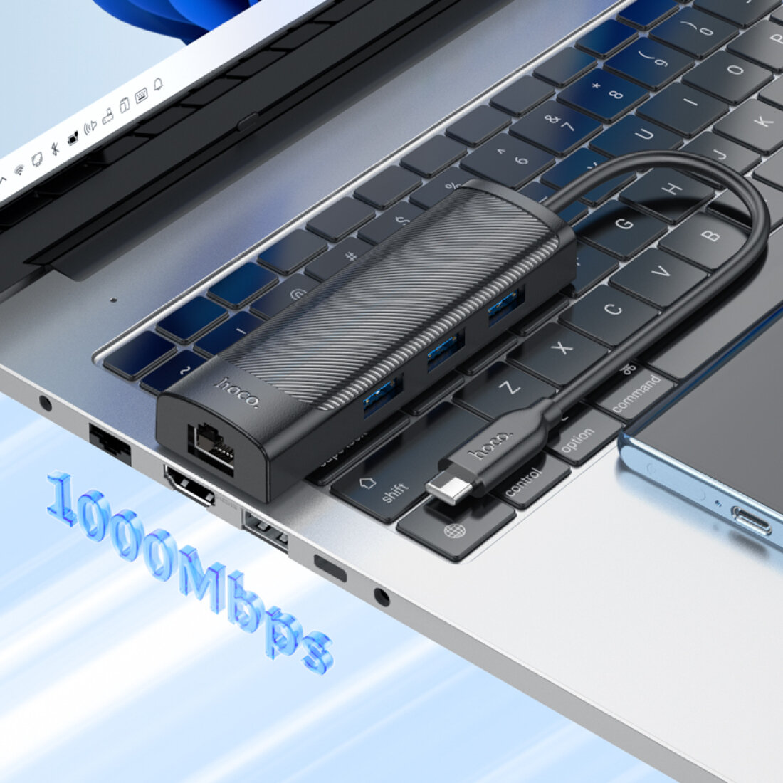 Купить USB Хаб (HB42) с 1 Type-C на 3 USB 3.0+RJ45, HOCO, L=0.2M, черный