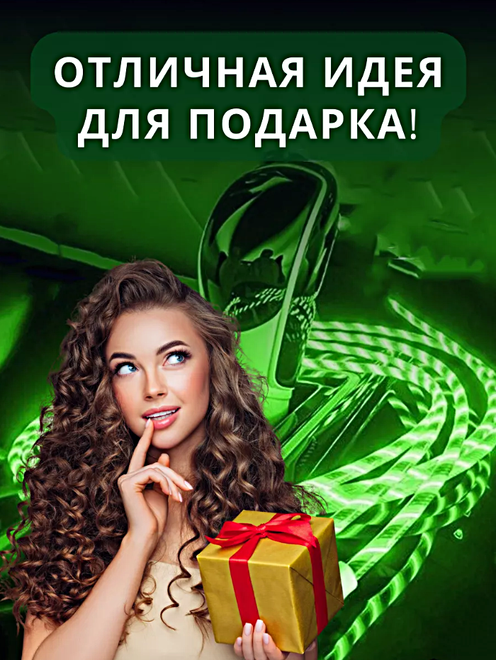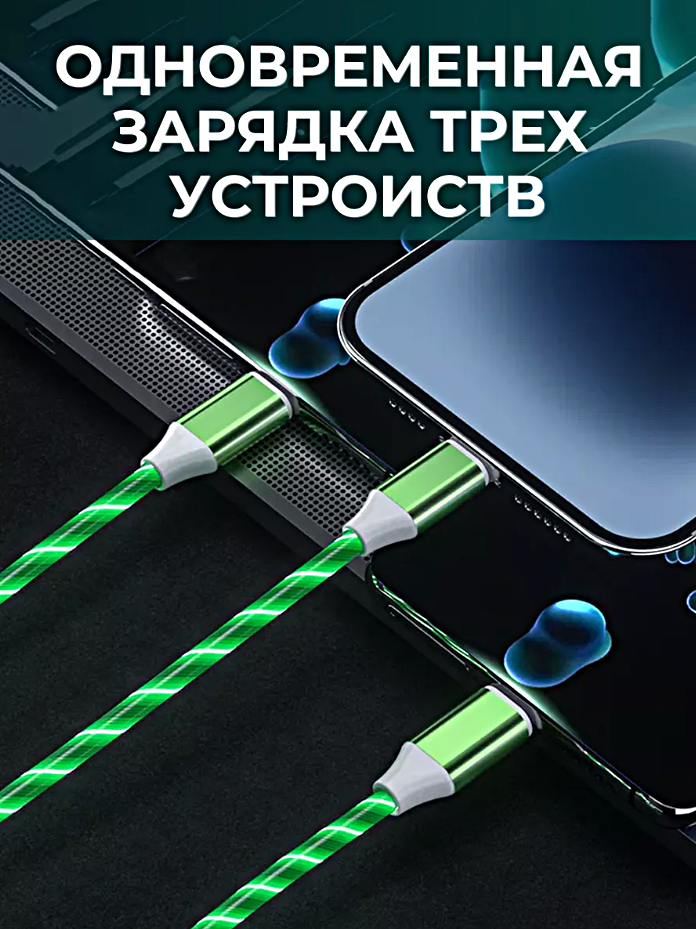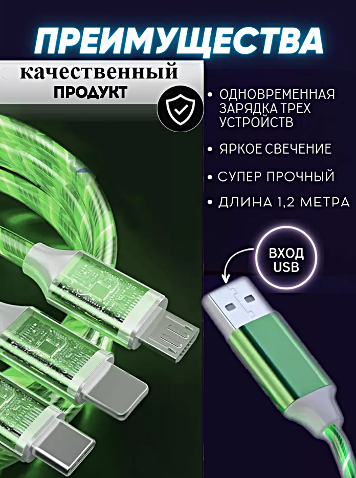 СохранитьЗарядный кабель светящийся 3 в 1, Зарядный кабель с подсветкой и 3 разъемами MicroUSB, Type-C, Lightning, 120см, Зеленый интересное: