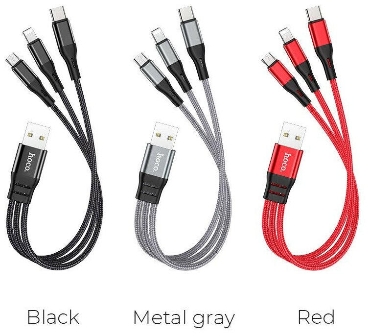 Кабель для айфон USB HOCO X47 Harbor 3 в 1 USB - Type-C + Lightning + MicroUSB, 2.4А, 25 см, серый металлик