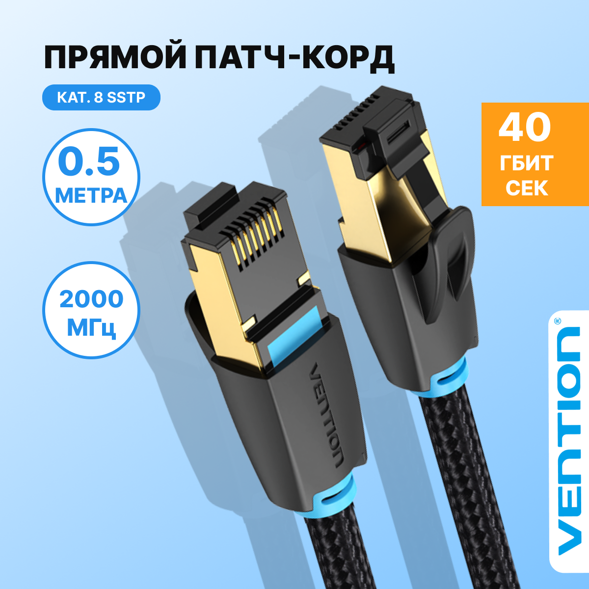 Патч-корд Vention прямой SFTP cat.8 RJ45 - 0,5м. Черный Тканевая оплетка