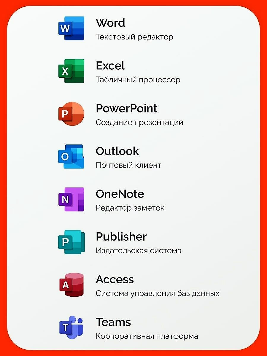 | Состав пакета | Microsoft Word 2021 • Microsoft Excel 2021 • Microsoft Access 2021 • Microsoft Lync 2021 • Microsoft OneNote 2021 • Microsoft Outlook 2021 • Microsoft PowerPoint 2021 • Microsoft Publisher 2021 |