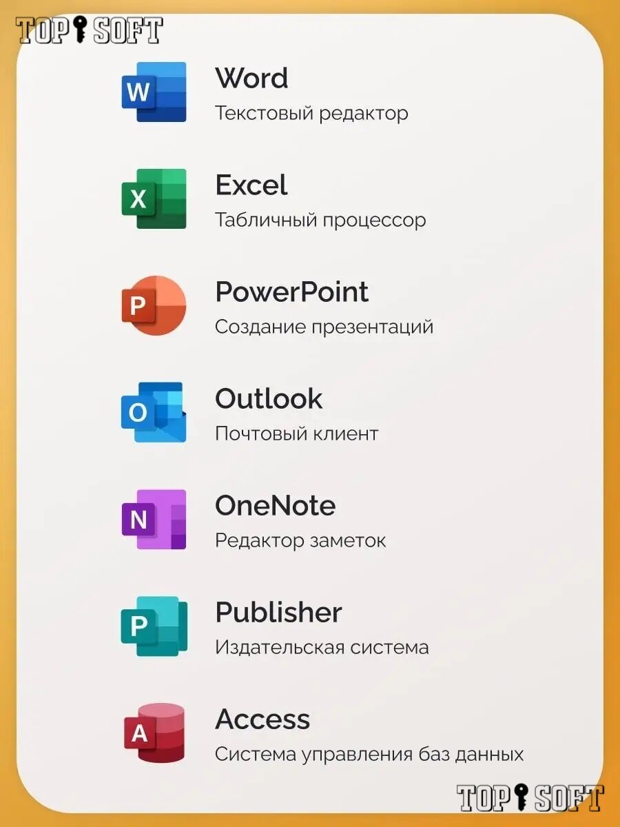 | Состав пакета | Microsoft Word 2021, Microsoft Excel 2021, Microsoft PowerPoint 2021, Microsoft Outlook 2021, Microsoft Publisher 2021, Microsoft Access 2021, Microsoft Publisher 2021, Microsoft OneNote 2021, Microsoft Outlook 2021 |