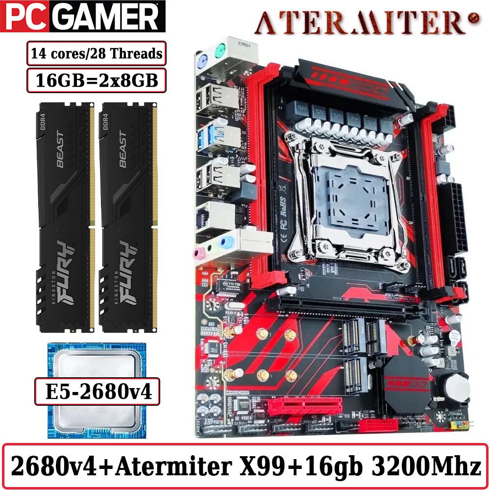 Комплект материнская плата Atermiter X99 D4 + Xeon 2680V4 + 16GB DDR4 ECC REG 2x8GB RED