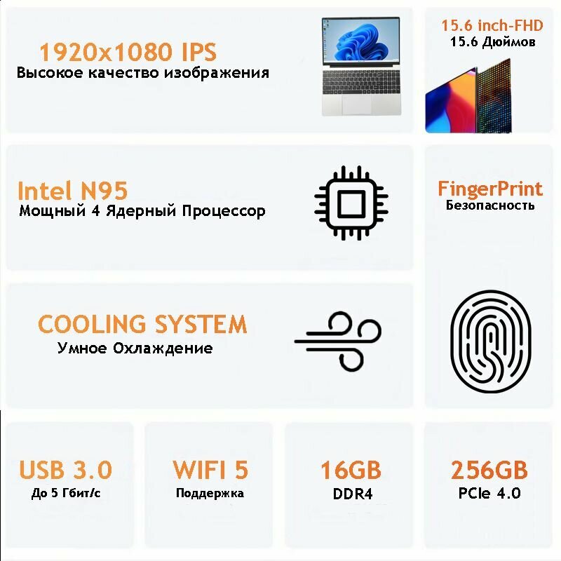 Ноутбук 15.6", Intel N95 (3.4 ГГц), RAM 16 ГБ, SSD 256 ГБ, Intel UHD Graphics, Windows 11 Pro, Серый, Русская раскладкаСтуденческие игры ноутбуки, Студенческие игры ноутбуки, рабочие ноутбуки,