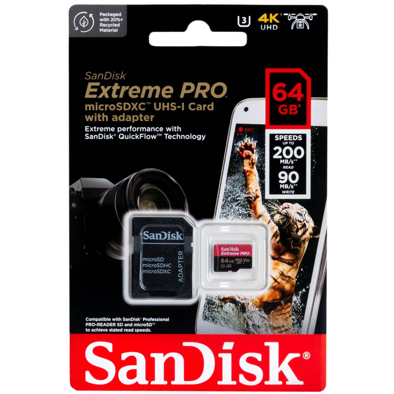 Купить Карта памяти SanDisk Extreme PRO microSDXC 64 ГБ Class 10 UHS-I U3, V30, A2 (R/W 200/90 Mb/s) + SD адаптер