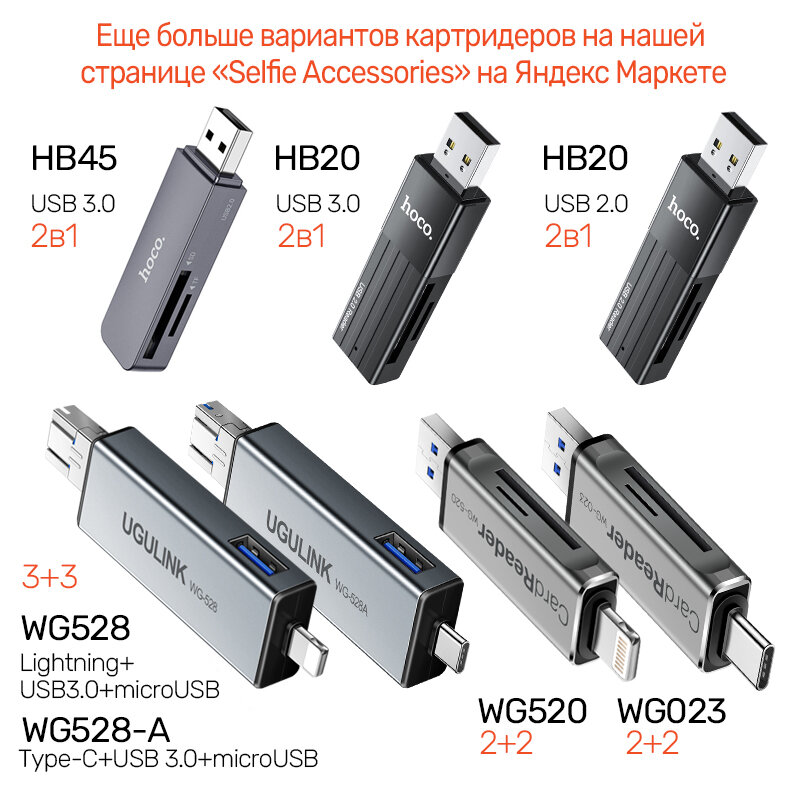 Универсальный Адаптер OTG Картридер 6 в1 для SD + MicroSD / TF карт и USB диск, три выхода Lightning + USB 3.0 + microUSB, UGULINK WG-528 интересное: