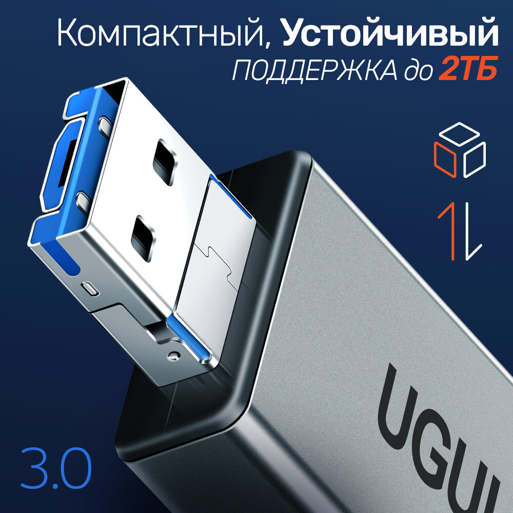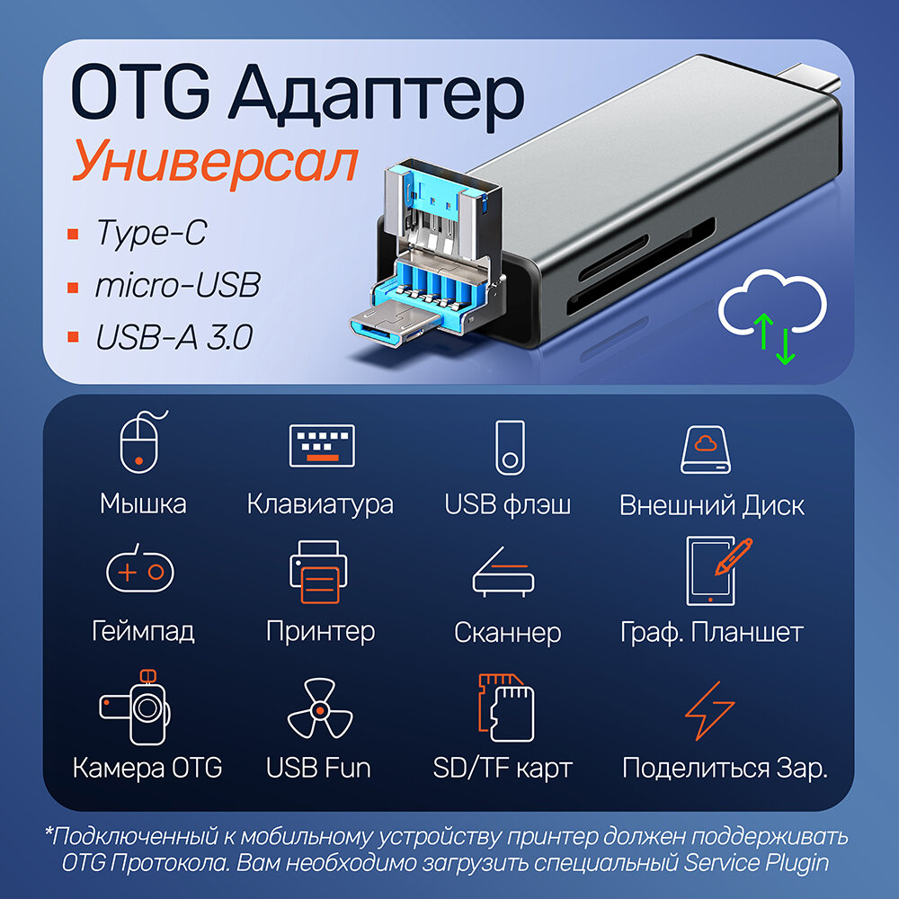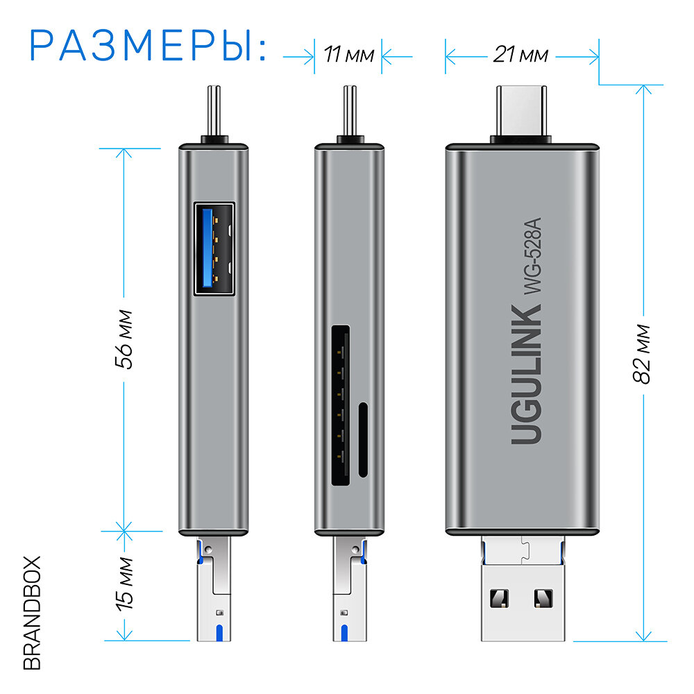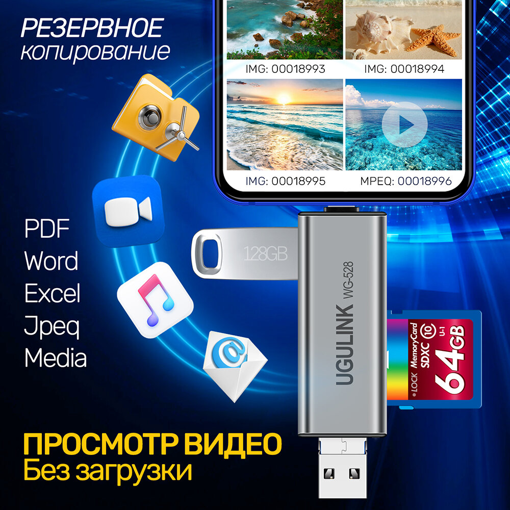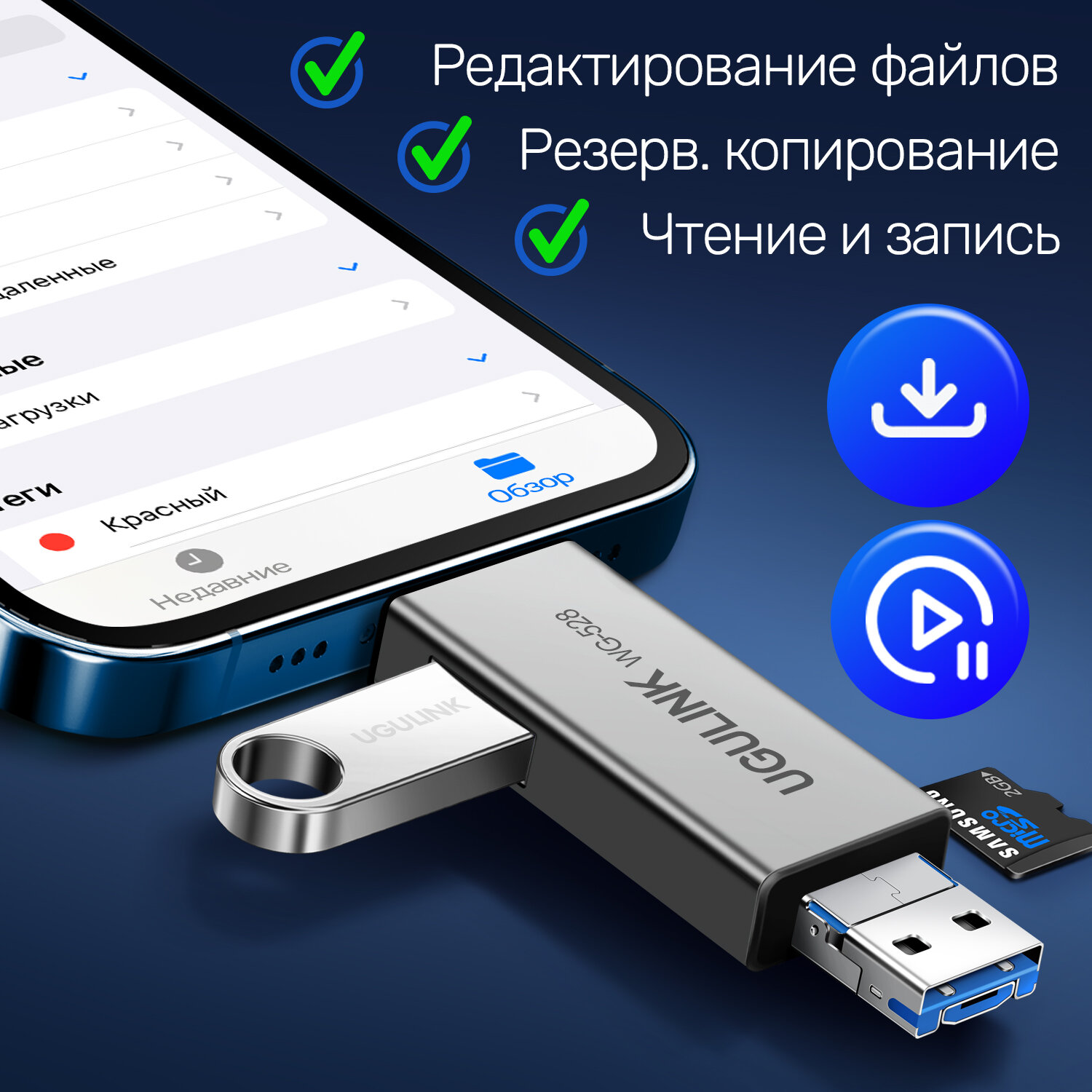 Универсальный Адаптер OTG Картридер 6 в1 для SD + MicroSD / TF карт и USB диск, три выхода Type-C + USB 3.0 + microUSB, UGULINK WG-528A интересное: