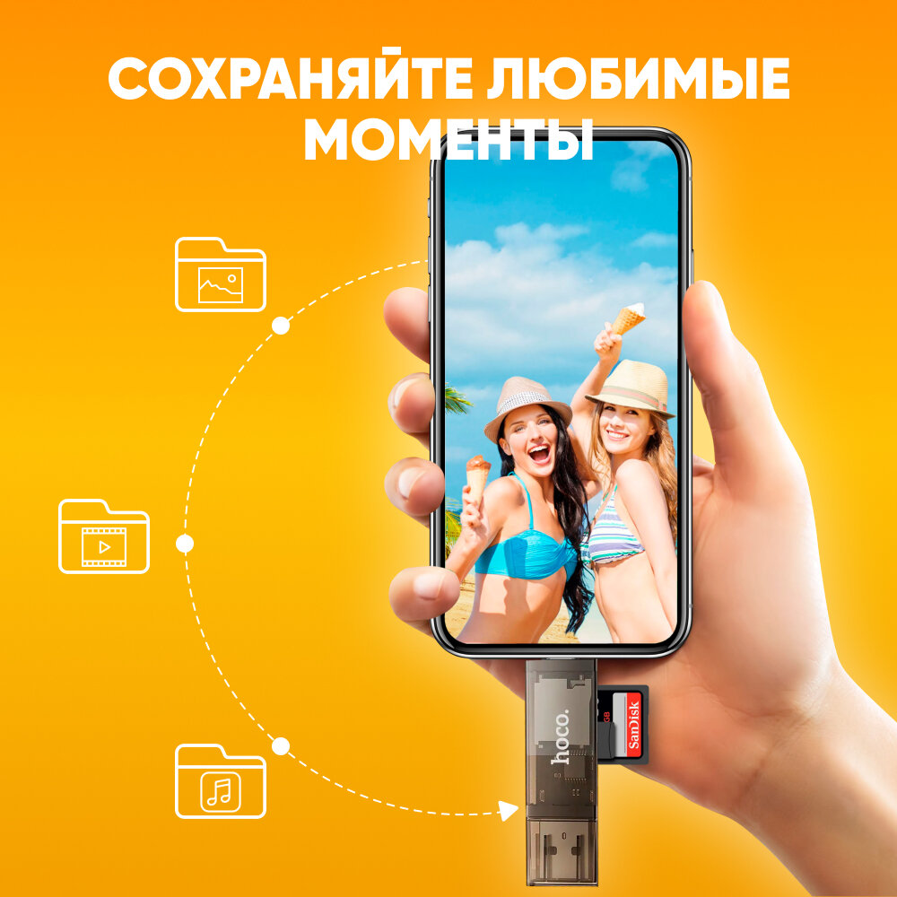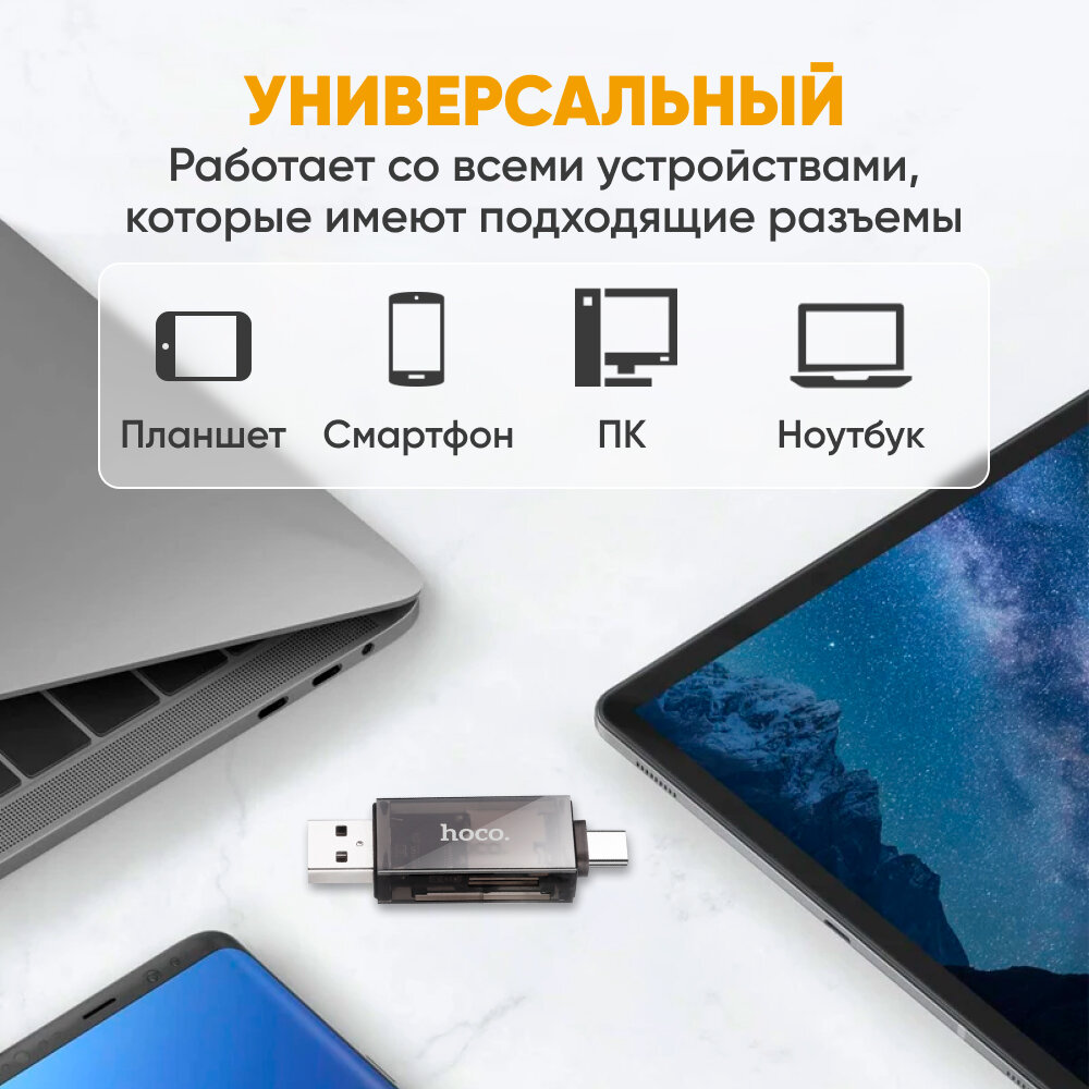 Картридер HOCO dhd01 Type-C-USB 2.0, прозрачный / Переходник для карт памяти SD/ TF для ПК ноутбука, черный / Адаптер USB type-C 480 мб/с Plug&Play, карты до 2ТБ интересное: