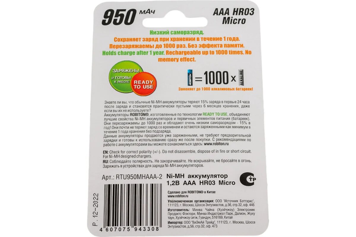 Ni-Mh аккумуляторы ROBITON RTU950MHAAA-2 BL-2 9792, 1.2В, 950мАч, размер ААА (HR03), LSD низкий саморазряд, металлогидридные, 2шт в упаковке