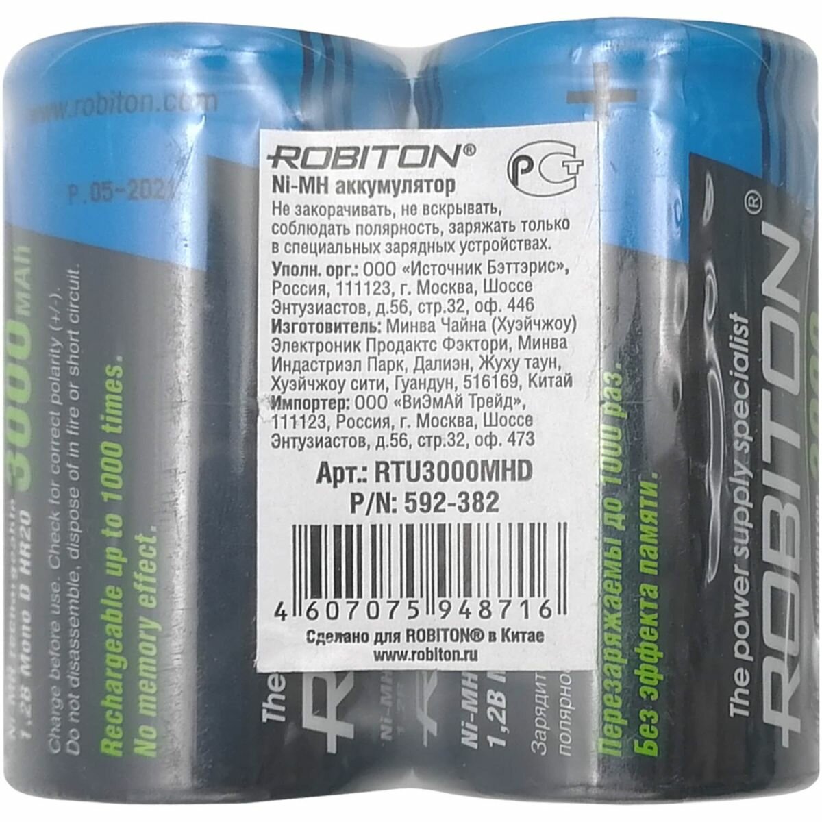 Аккумуляторы Ni-Mh металлогидридные Robiton RTU3000MHD HR20 D 3000 мАч 1,2 В 2шт Robiton 305-02