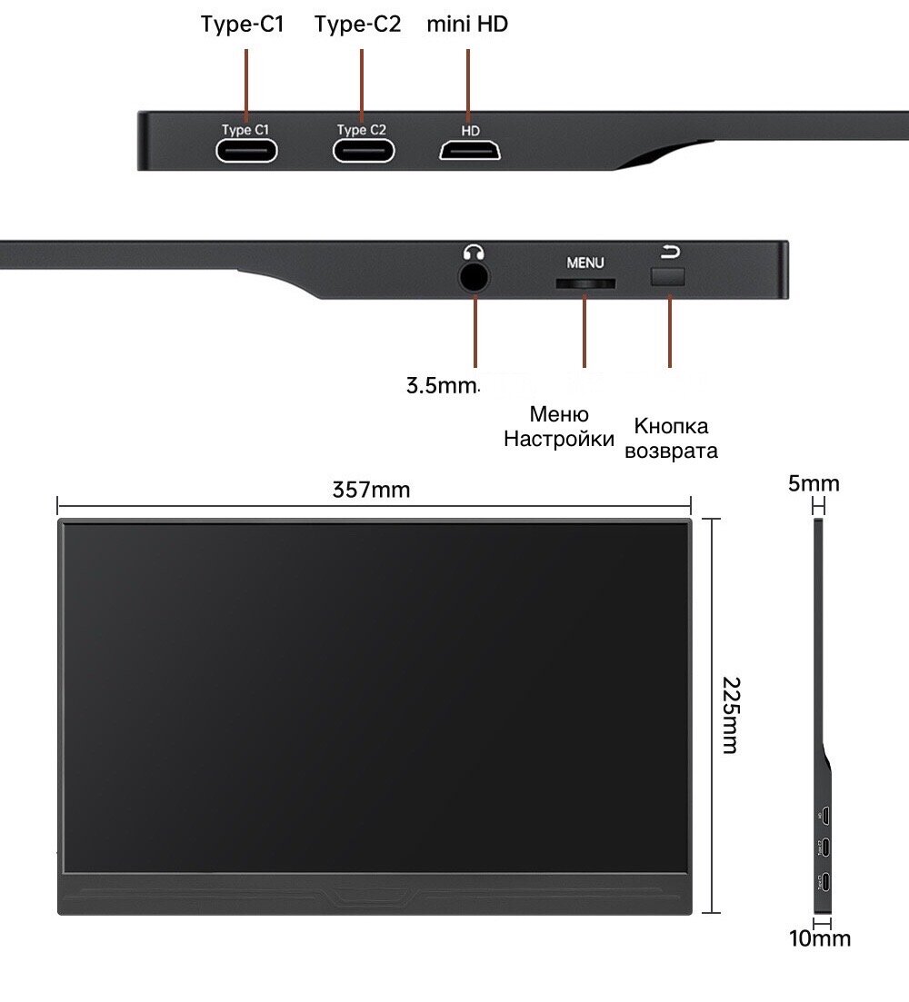 | Подробная комплектация | Портативный монитор 15,6”, магнитный чехол, кабель type C / USB, кабель type C / type C, кабель mini Hdmi / Hdmi, блок питания, инструкция. |