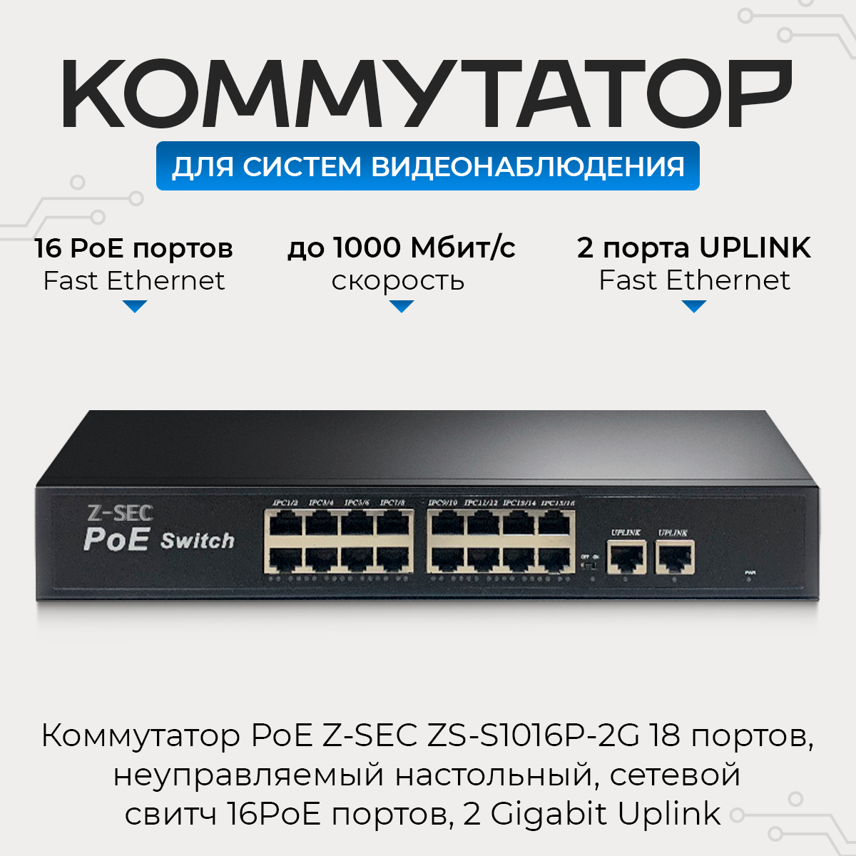 Купить Коммутатор PoE Z-SEC-1018G 18 портов, неуправляемый, настольный, сетевой свитч 16 PoE портов, 2 Gigabit Uplink