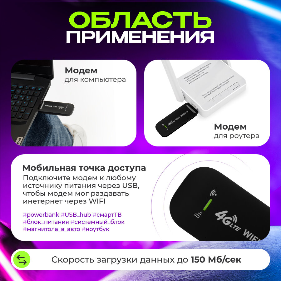 | Дополнительная информация | Беспроводной модем можно использовать как напрямую подключив к ноутбуку или компьютеру, так же через блок питания для раздачи интернета и даже подключить к магнитоле |