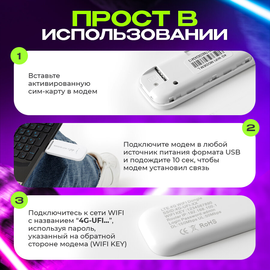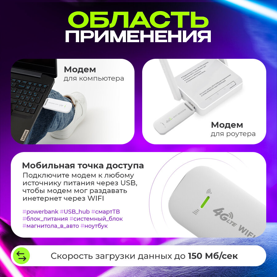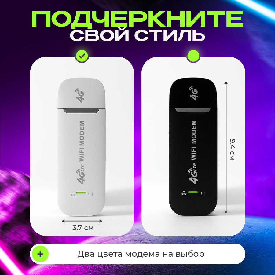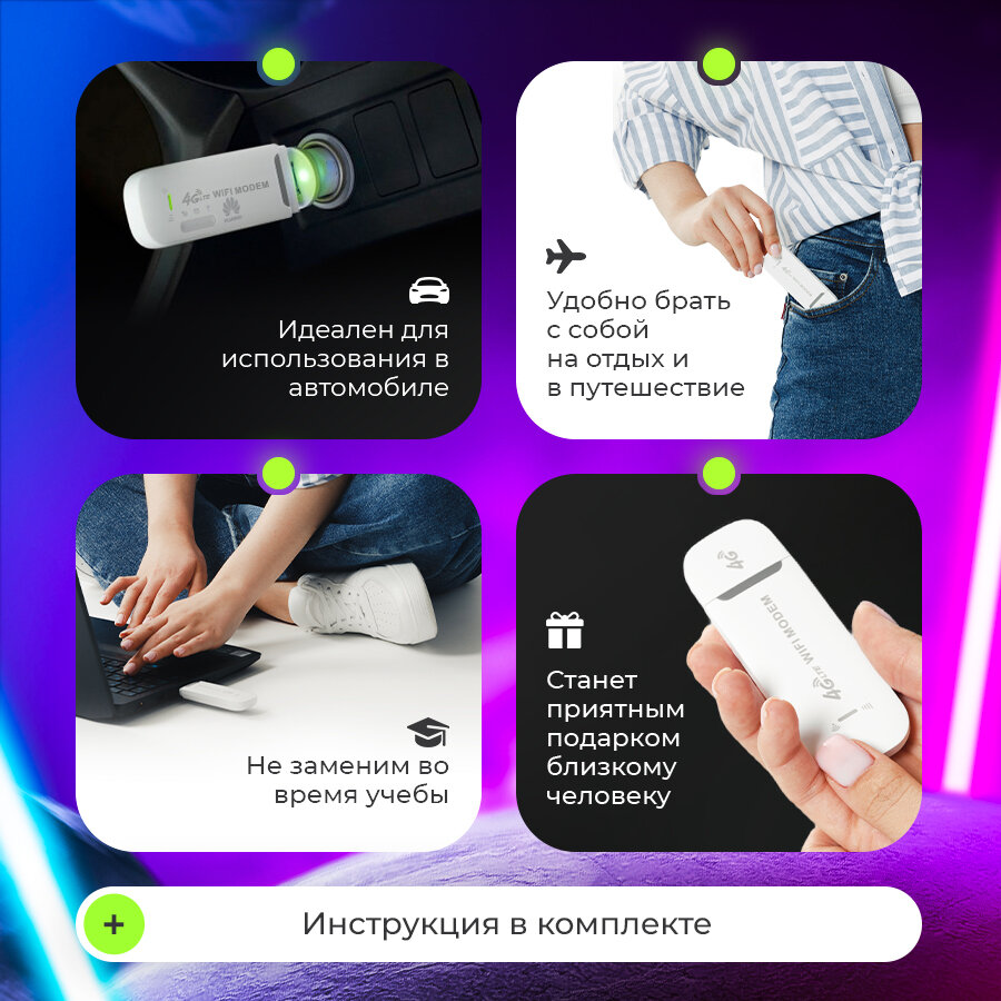 | Дополнительная информация | Беспроводной модем можно использовать как напрямую подключив к ноутбуку или компьютеру, так же через блок питания для раздачи интернета и даже подключить к магнитоле |