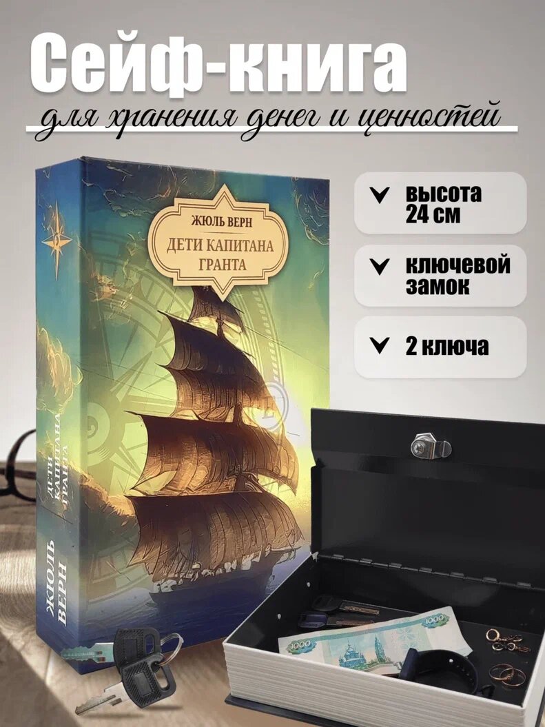 Купить Книга сейф шкатулка для денег с замком AXLER, тайник для хранения денег с ключом металлический, "Дети Капитана Гранта"