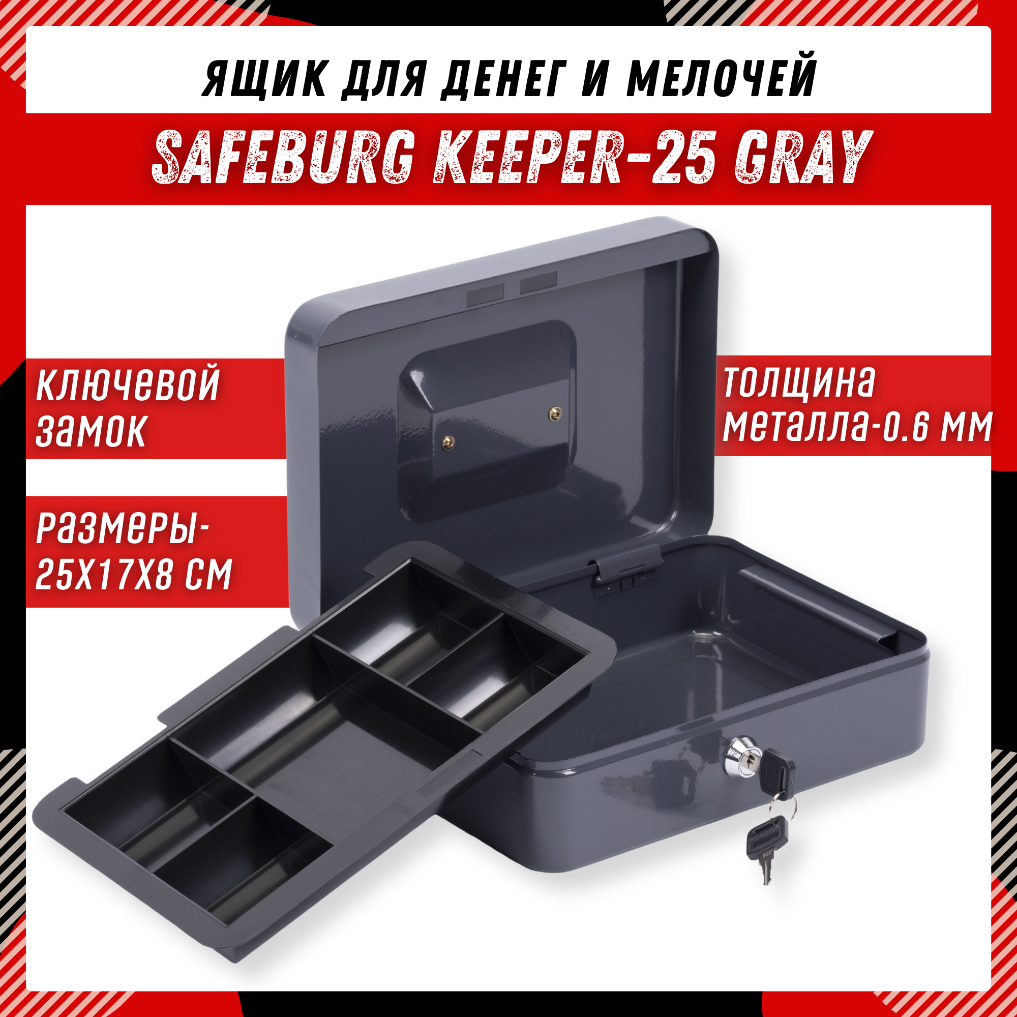 Ящик для денег SAFEBURG Keeper-25C Red Gloss, переносной сейф кэшбокс, лоток 3 отделения. Шкатулка для ценностей, тайник