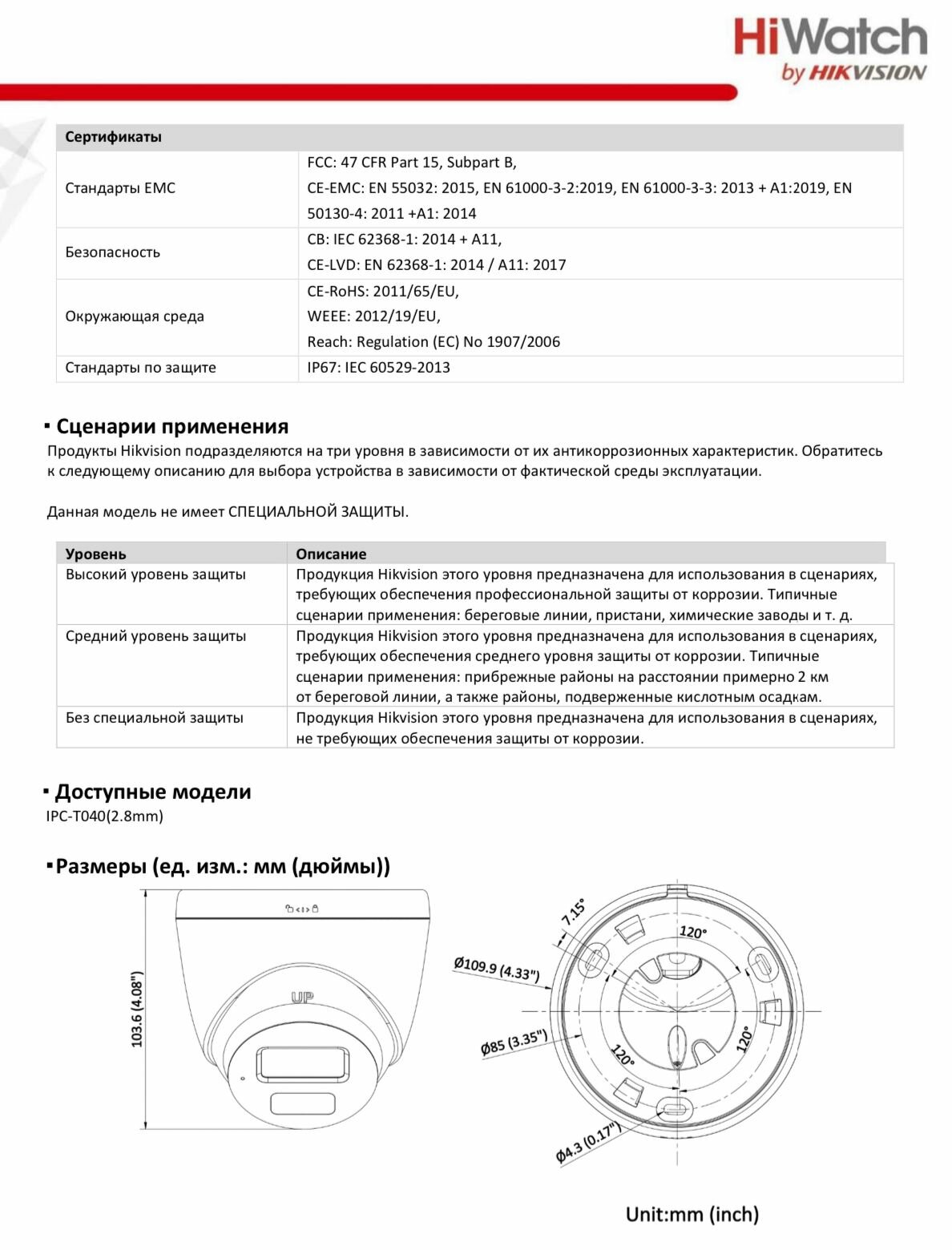 | Функции и особенности | DWDR / ИК-подсветка / ИК-фильтр / встроенный микрофон |