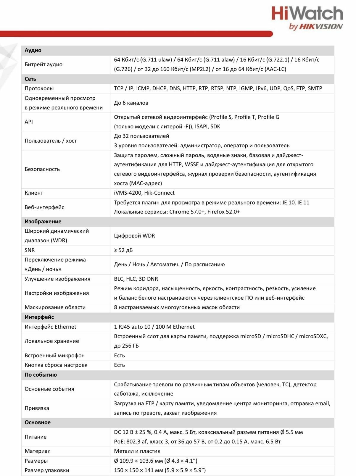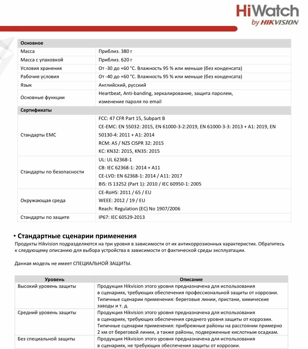 | Дополнительная информация | защита паролем, сложный пароль, шифрование HTTPS, фильтрация IP-адресов, журнал проверки безопасности, базовая и дайджест-аутентификация для HTTP/HTTPS, TLS 1.2, WSSE |