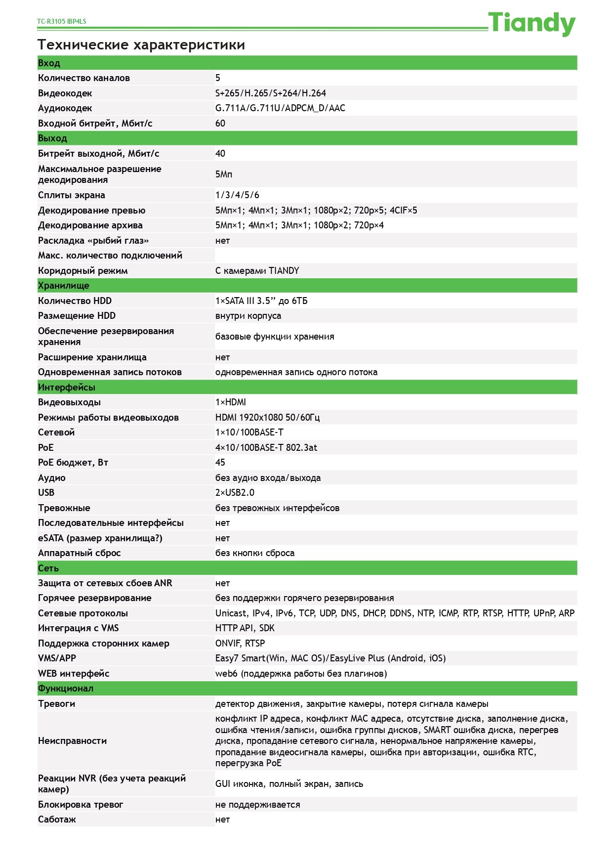 Видеорегистратор сетевой 5-канальный 5Мп на 1 HDD, c PoE коммутатором Tiandy TC-R3105 Spec:I/B/P4/L/S интересное: