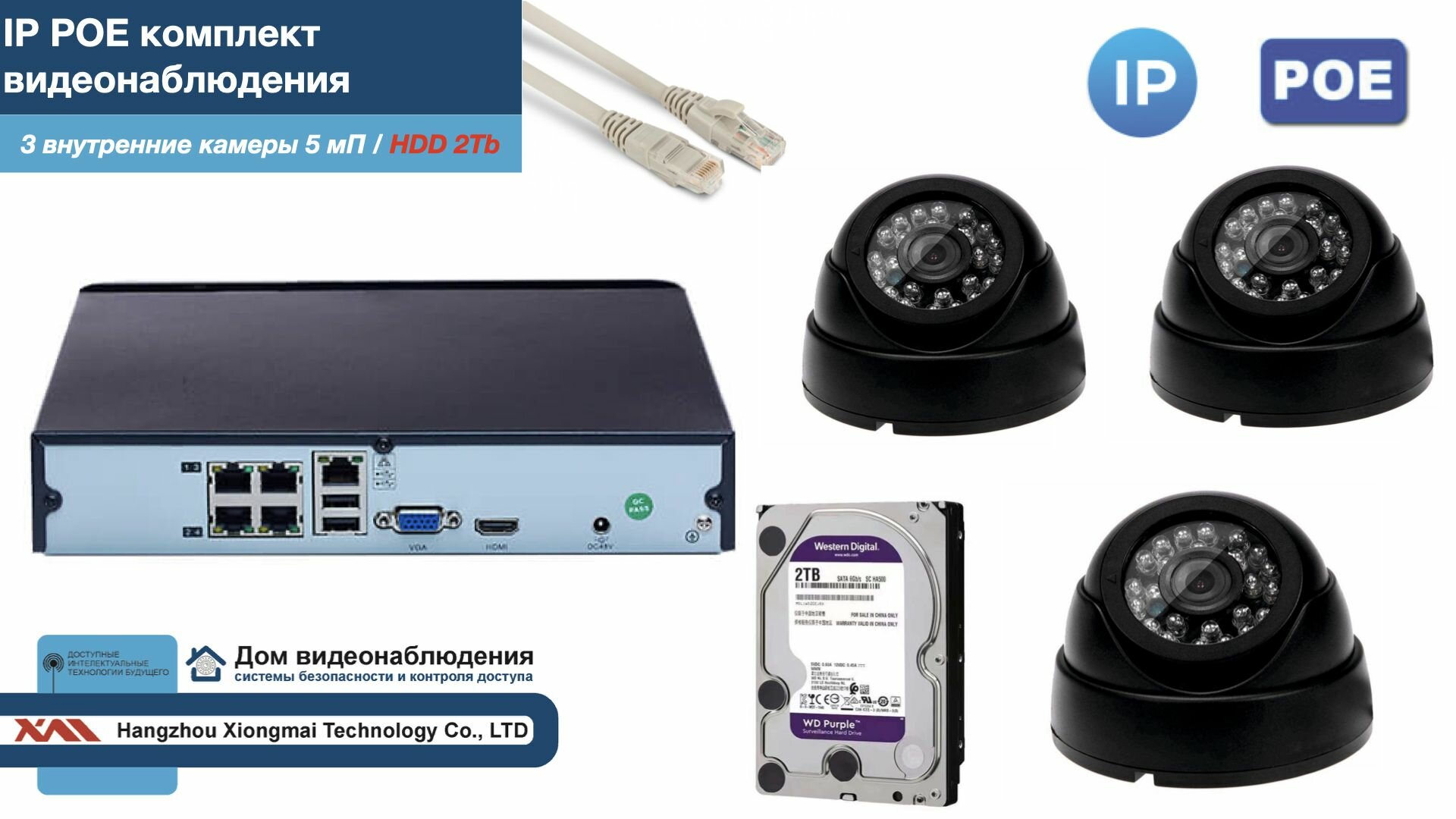 Полный IP POE комплект видеонаблюдения на 3 камеры (KIT3IPPOE300B5MP-2-HDD2Tb) интересное:
