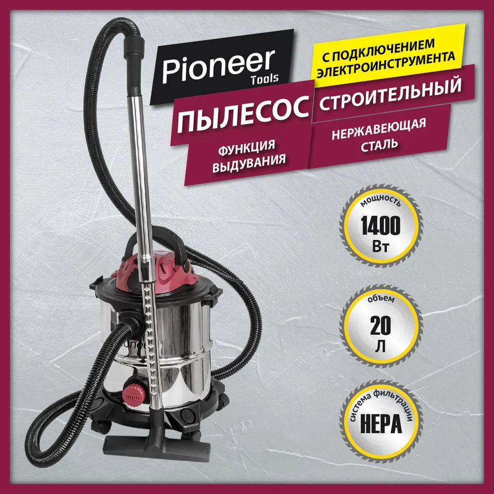 Пылесос строительный бытовой с насадками Pioneer VC286C, 20 л, HEPA-фильтр, розетка на корпусе 220 В, телескопическая трубка, функция выдува, 1400 Вт