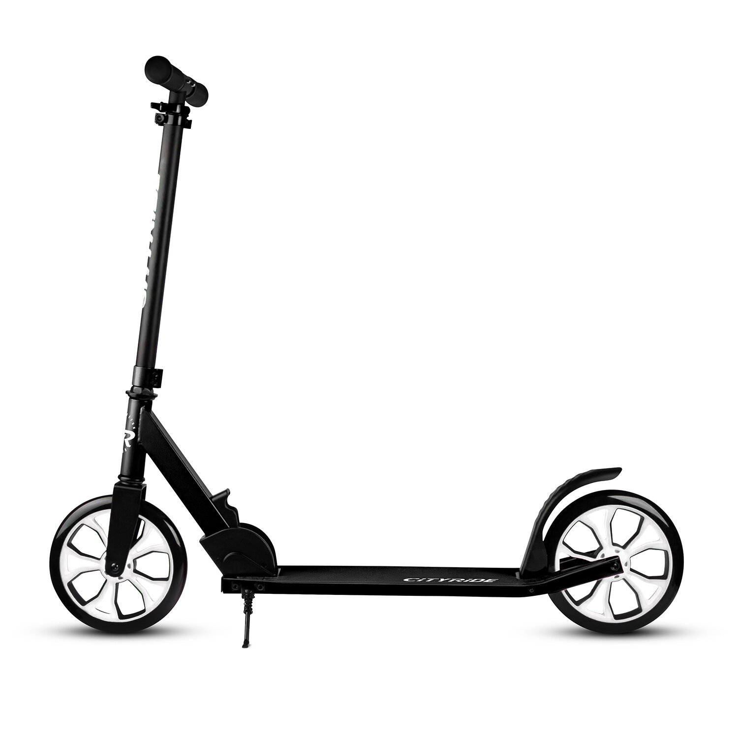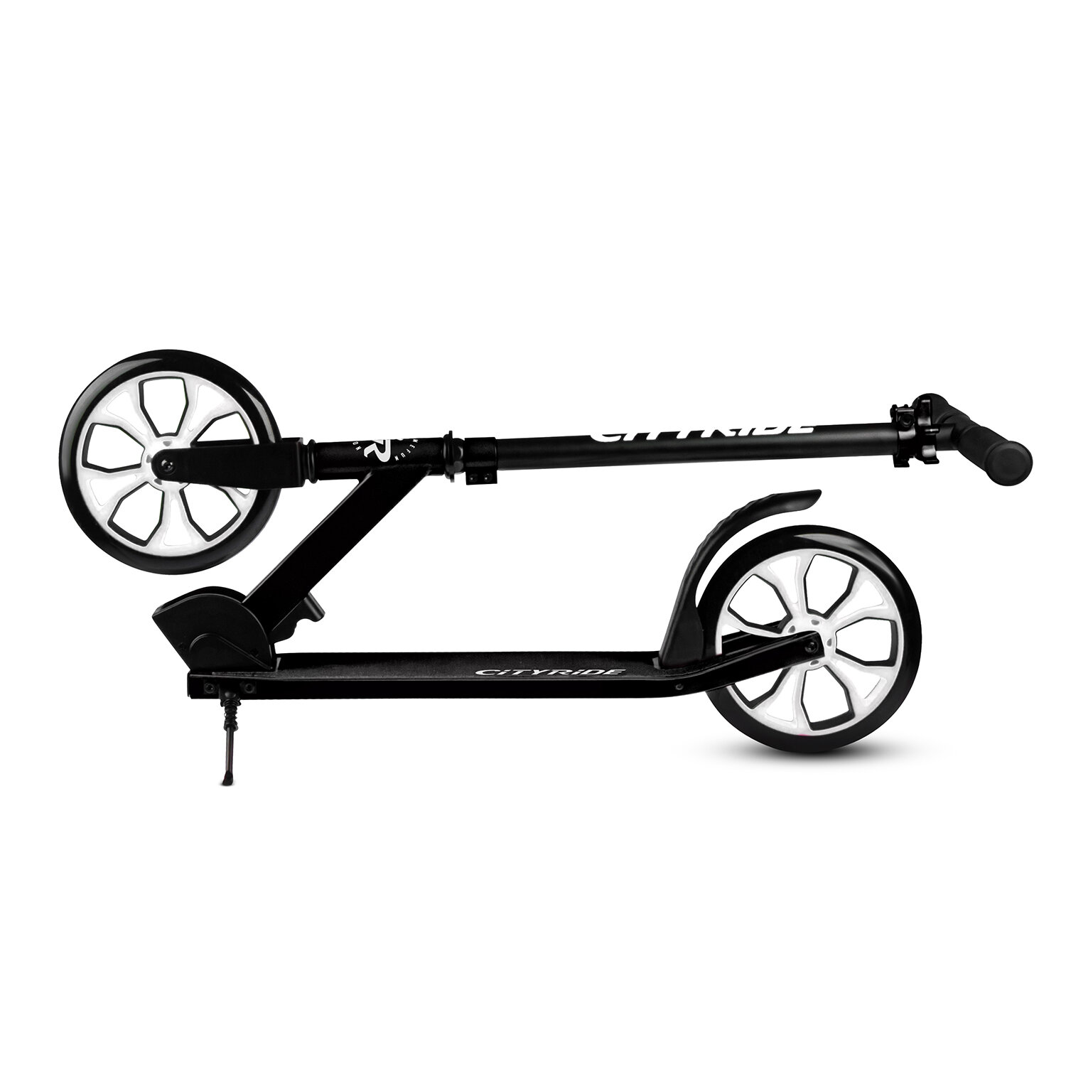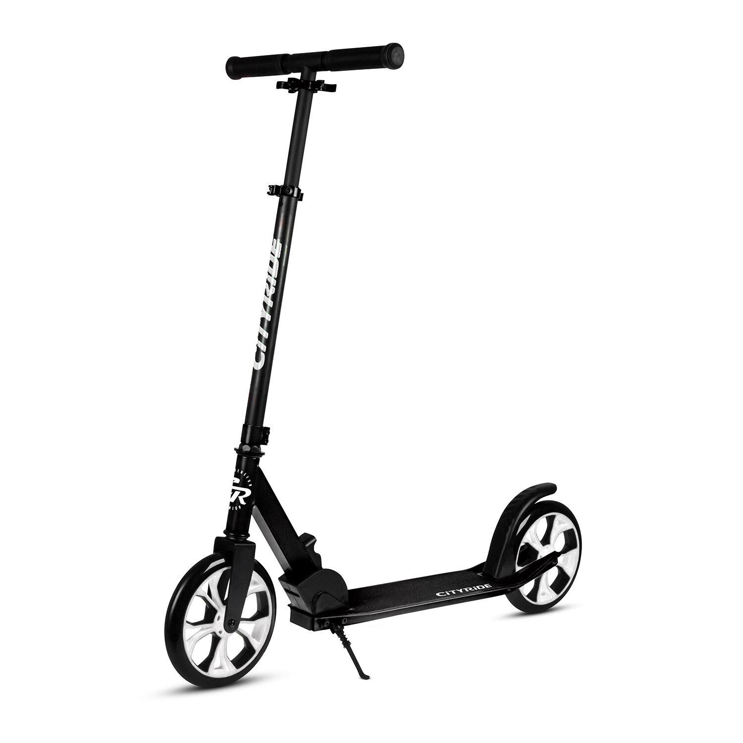 Самокат двухколесный CITY-RIDE, дека, алюминий анодированный, t-bar сталь, колеса PU 200/200, подножка, цвет черный