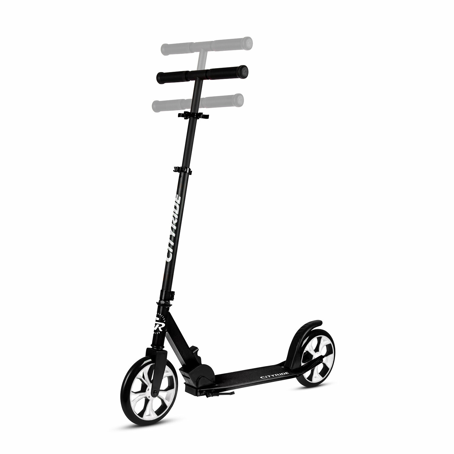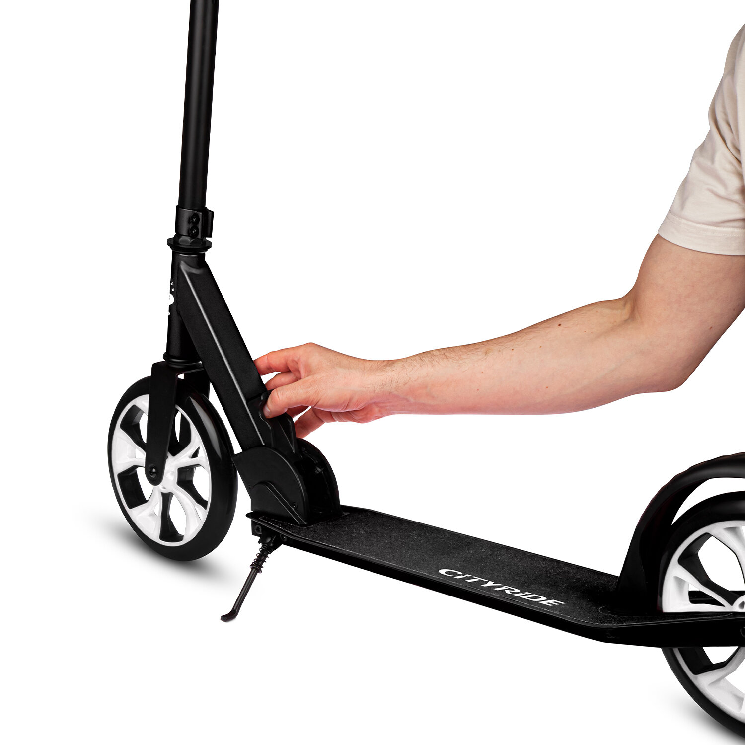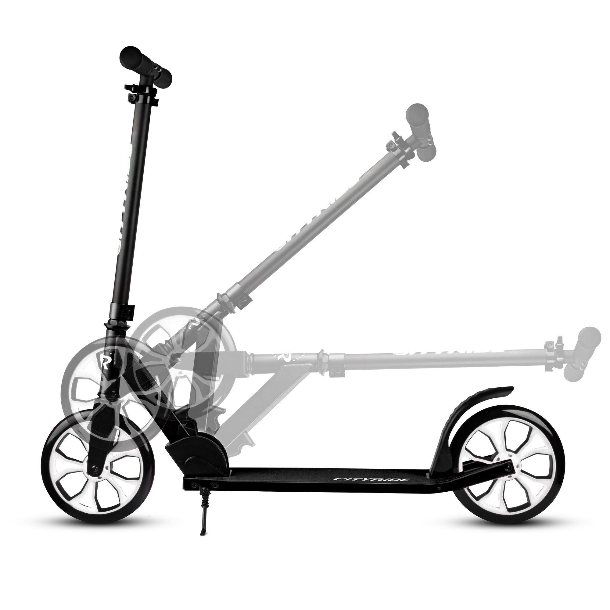 Самокат двухколесный CITY-RIDE, дека, алюминий анодированный, t-bar сталь, колеса PU 200/200, подножка, цвет черный