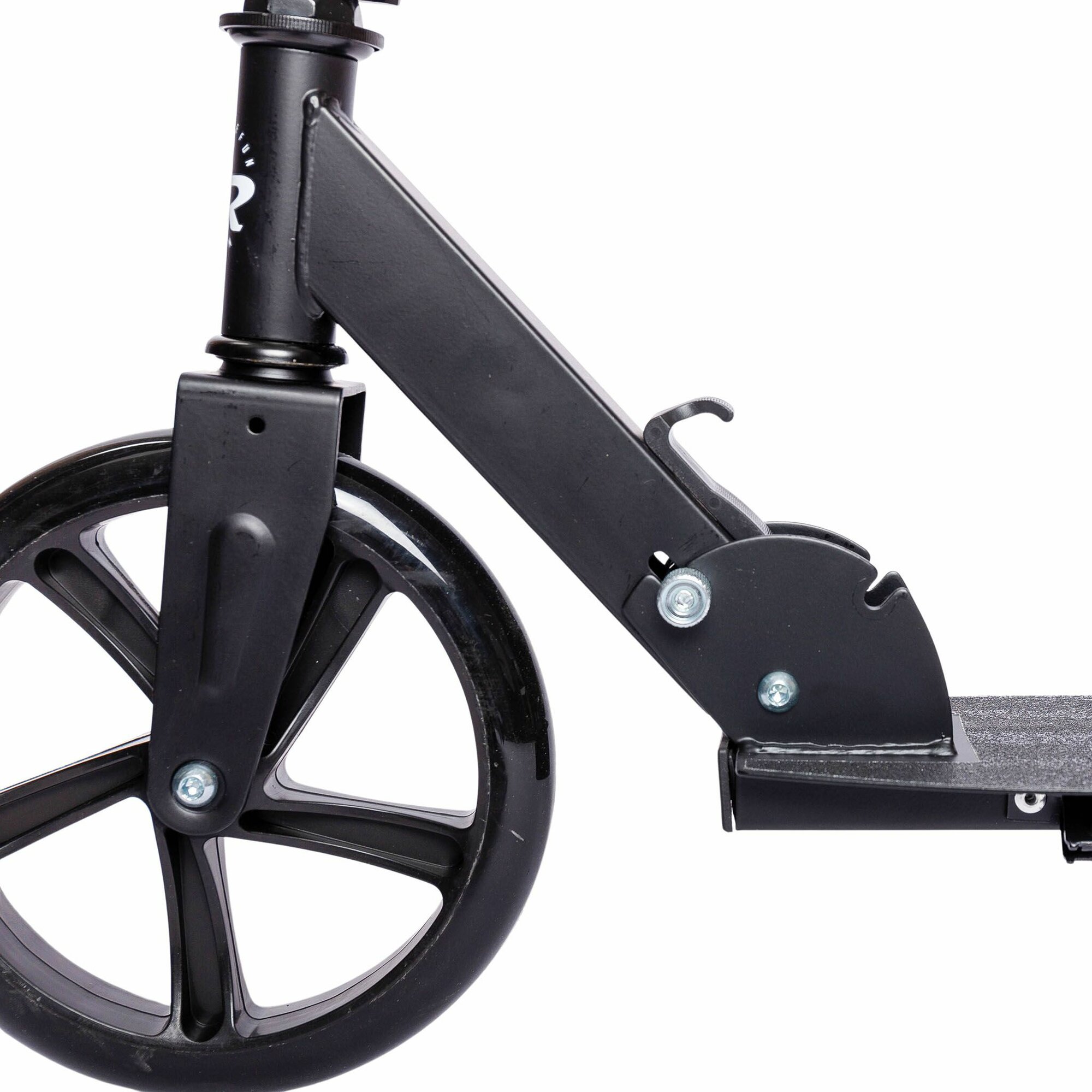 | Минусы: | Качество изготовления откровенно низкое. У самоката из коробки сразу сильный люфт всех не сварных элементов: петли для складывания, ручки. У петли для складывания очень тонкая толщина стержня винта, который не даёт ему складываться. Ни о какой длительной нагрузке в 100 кг на этот механизм и речи идти не может.