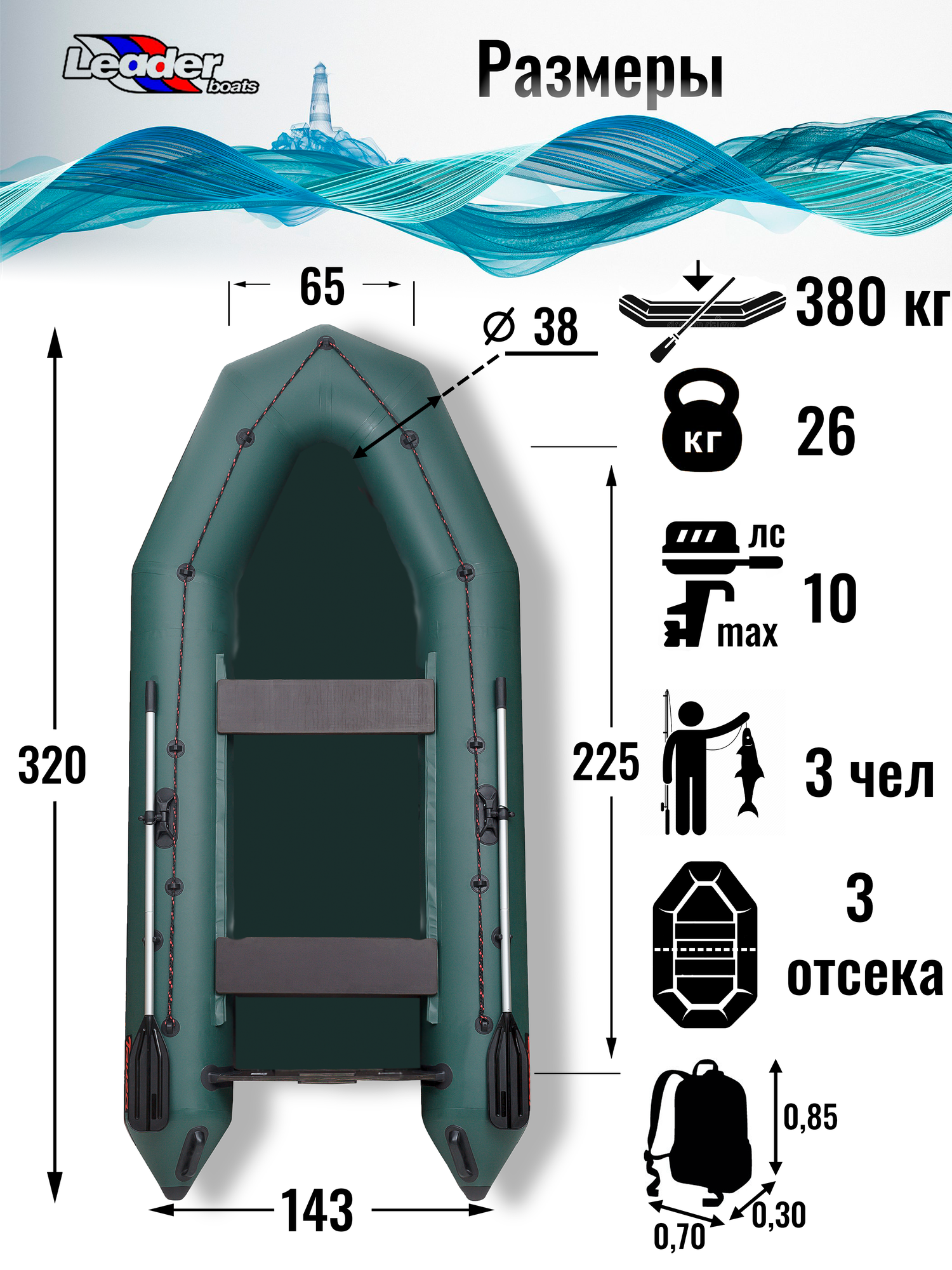 | Внешние размеры лодки (Ш х Д) | 143 х 320 см |