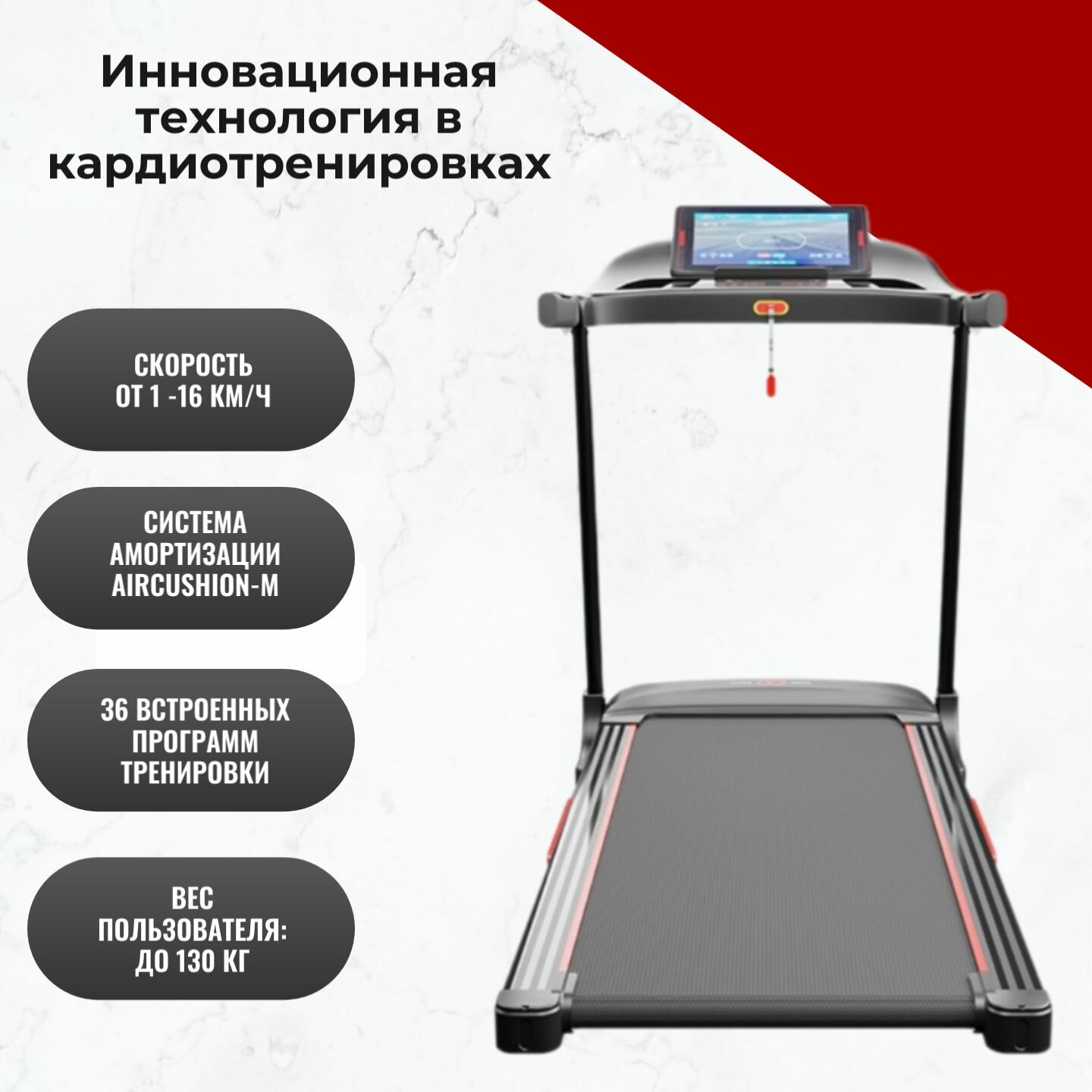 | Особенности | разъем для MP3; возможность подключения беспроводного кардиодатчика; встроенный кардиодатчик; крепление кардиодатчика: на ручке; подставка для книг, подставка для стакана; регулировка наклона: 0-15%; система складывания: гидравлическая SmartFold; система амортизации: Air Cushion M; диаметр передних валов: 42 мм; диаметр задних валов: 50 мм; дека: MDF 18 мм; 7-ми дюймовый LCD дисплей с голубой подсветкой |