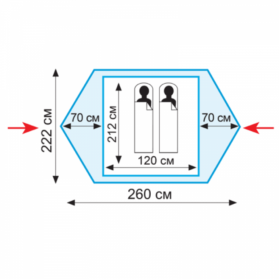 | Габариты внешней палатки(ДxШxВ) | 222x260x102 cм |