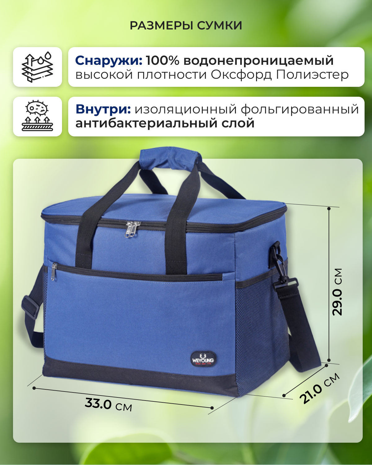 | Дополнительная информация | автомобильный; бокса; водонепроницаемая; дорожный; еды; изотермическая; контейнер; ланч; мини-холодильник; напитков; обеда; отдых; переносной; пикник; портативный; походный; путешествие; сумка; сумка-холодильник; термо; термосумка; термохолодильник; холодильник; подробная комплектация: Термосумка - 1 шт, плечевой ремень - 1 шт, упаковка - 1 шт.; максимальная нагрузка: 30 кг; принцип охлаждения: требуется аккумулятор охлаждения, без аккумулятора охлаждения |