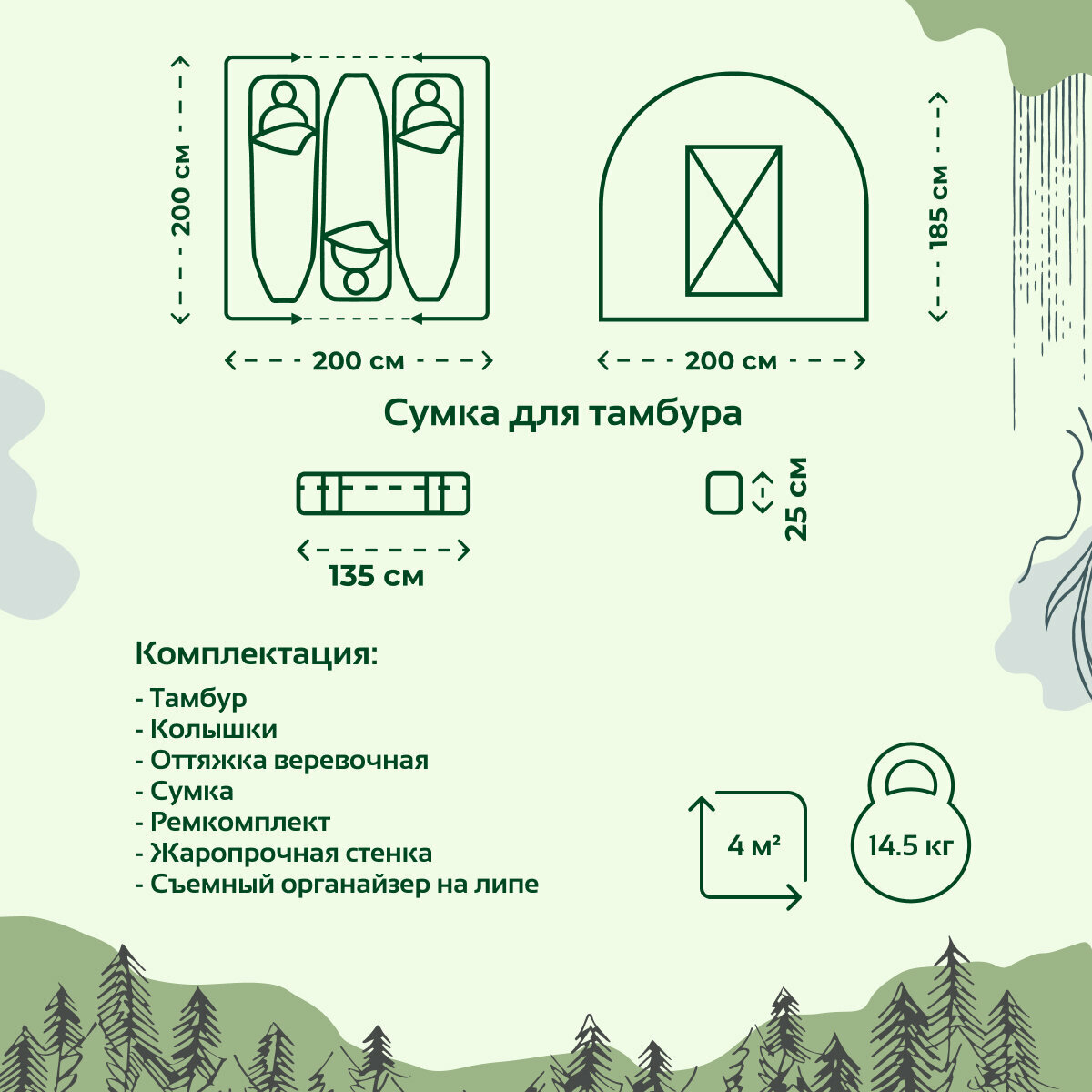 | Особенности | вентиляционные окна / ветрозащитная юбка / внутренние карманы / окна / усиленные углы |